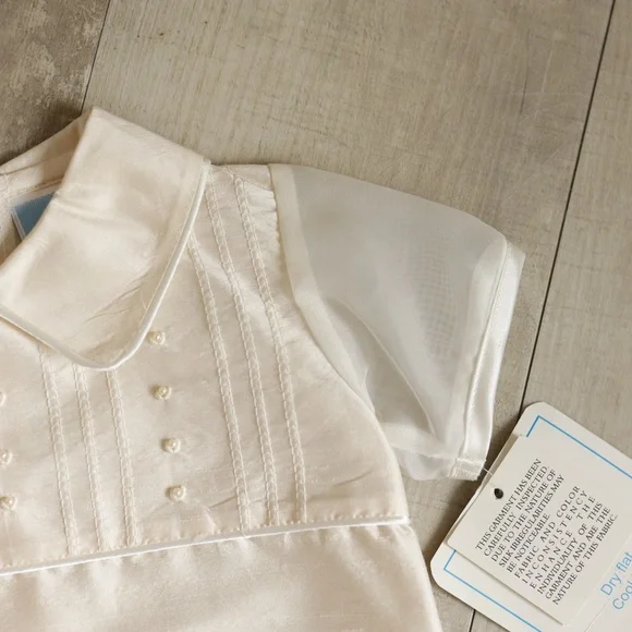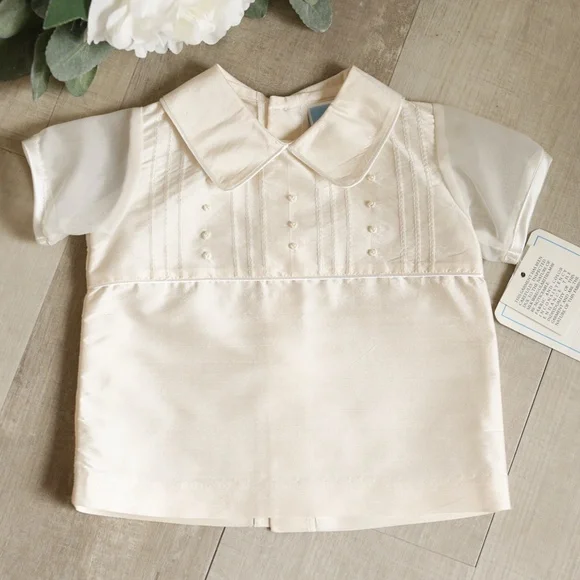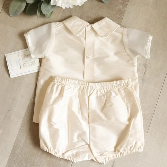 This Baby Boy´s Silk Outfit is Gorgeous!!The set is done by Will´Beth, a high-end Boutique brand.Done in a stunning cream 100% Silk.The point collar is trimmed in an ivory satin piping.The chest has four sections of flat pintuckswith bullion embroidery and pearl details in-between the sections.A matching ivory satin piping borders the chest details. The sleeves are done in a matching organza and havea matching satin piping trimThe back has a button closer.The diaper cover/shorts have an elastic waist and legs for comfort.STUNNING AND BEAUTIFUL-RARE FIND!!Size 0/3 MonthsShirt9.5" across chest from underarm seam to seam10" long from top of shoulder to bottom of shirt hemShorts 7.75" across waist from side seam to seam (top of shorts)6.5" long from waist to inseam7" long from waist to leg hem elastic (center of leg)