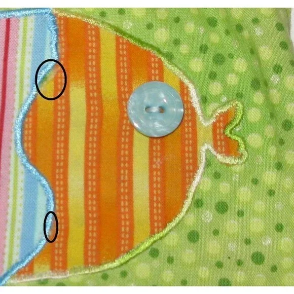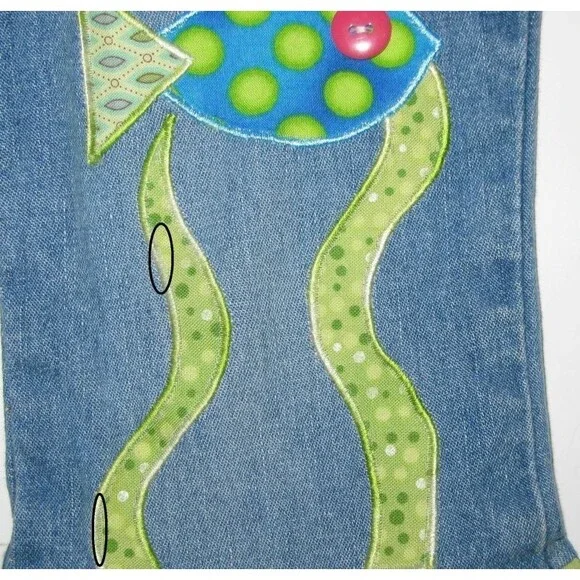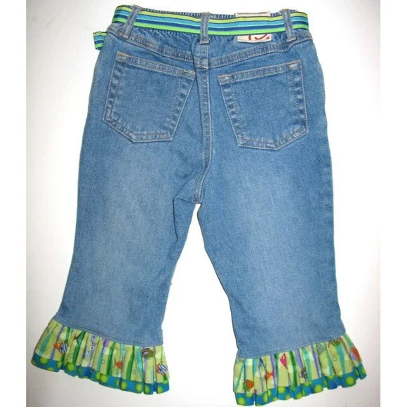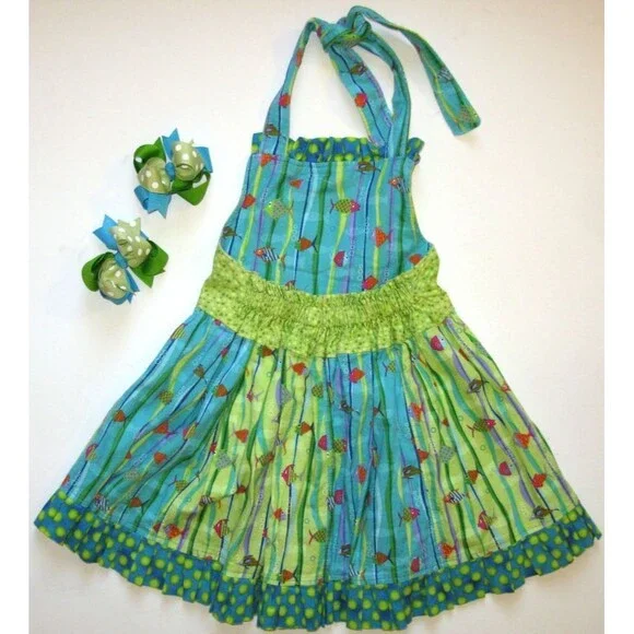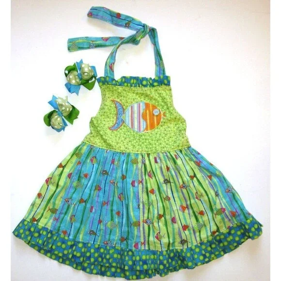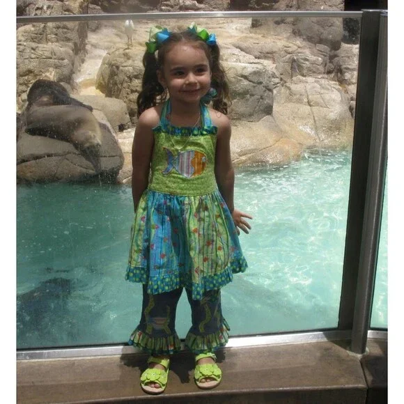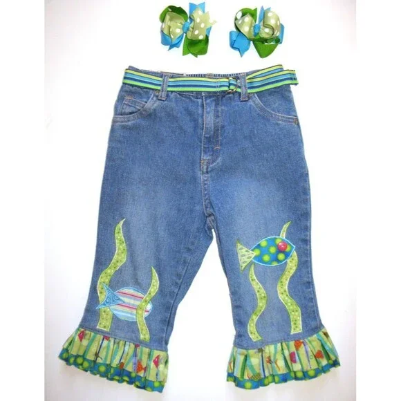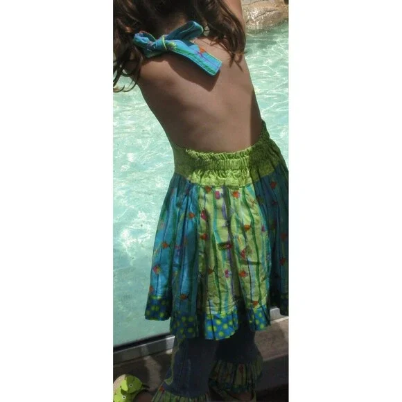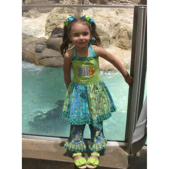 Vintage Custom set from The Charmed Child StudioE Boutique.Washed in cold and hung to dry~ Custom made sea life themed outfit in shades of green/blue/yellow/orange. This is cut to about a size 4 but would fit anywhere from a size 3-5.Items can be worn together as a set or separately.~ The bottoms are made from a size 4T The Children´s Place jeans with an elastic back waist, matching ribbon belt is included. These can be worn as full length or capris/cropped length. They have appliques of fish/seaweed on both legs and cute ruffles added to the hems. Pants are in EUC, PLEASE NOTE THAT THEIR ARE A FEW AREAS WHERE THE APPLIQUE HAS STARTED TO POP UP/UN-STITCH. I HAVE TRIED TO MARK A FEW OF THEM IN THE PICTURE WITH CIRCLES. THIS DOES NOT TAKE AWAY FROM THE WEARABILITY. Waist across the front measures 9 1/4" unstretched, inseam is 11", overall length is 18"~ The TWIRL top/dress is a halter style that ties behind the neck. The back has encased elastic for stretch and adorable fish applique on the front. Its in EUC, PLEASE NOTE THAT THEIR ARE A FEW AREAS WHERE THE APPLIQUE HAS STARTED TO POP UP/UN-STITCH. I HAVE TRIED TO MARK A FEW OF THEM IN THE PICTURE WITH CIRCLES.Length from top of bodice to hem is about 18 3/4", width across bodice/waist is about 9.5" and stretches to about 12"~ Included are 2 matching hair bows made by Emma Saxton Studios in the TRIO bow style specifically to match this outfit. They are on a French clip and measure about 3.5" across