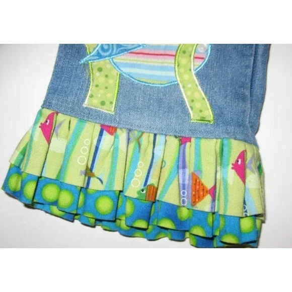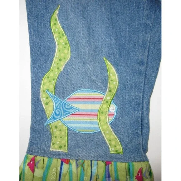 Custom boutique upcycle jeans dress top fish aquarium sea world blue green 3 4 5
