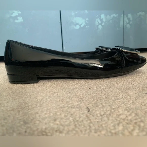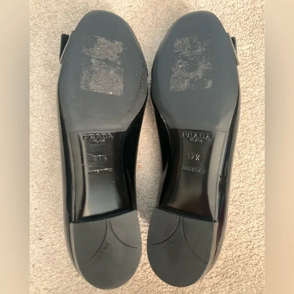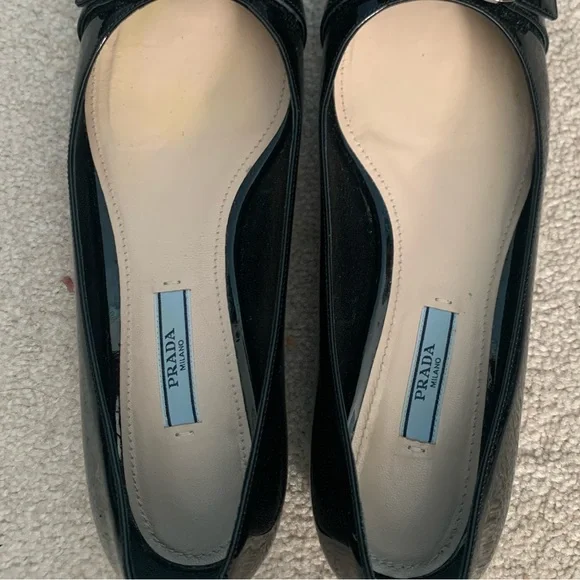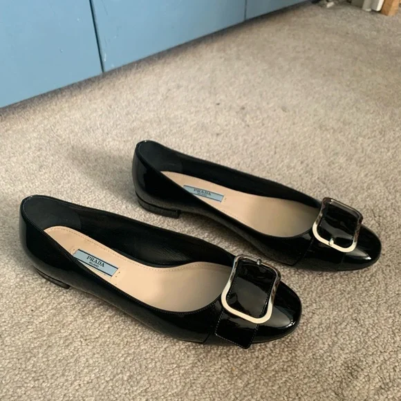Authentic beautiful Prada Calzature Donna Vernice Rosso ballet flats. Eye catching Black patent leather with over-sized shiny buckle. Made in Italy. Amazing craftsmanship, well made, sturdy, comfortable and high quality shoe. One of the most highly complimented shoes in my closer. In excellent condition and well maintained condition of the shoes, they were only worn a handful of times.