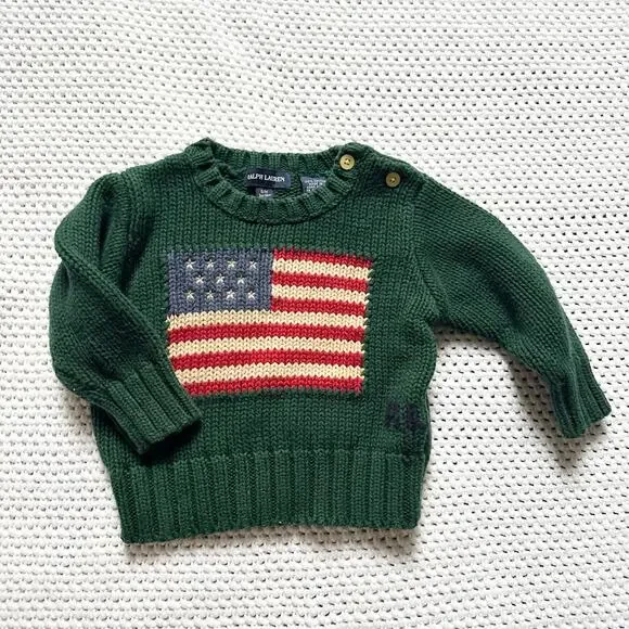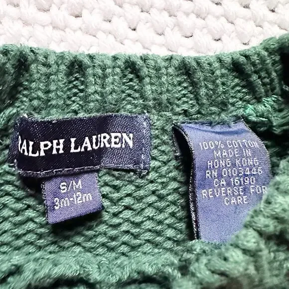 From Polo Ralph Lauren. Baby infant sizing. Can fit between 3 months to 12 months. Outfit set includes blue denim straight leg jeans. Size medium 6/12 months. Stretch waist band with snap button pant legs. Small discoloration on one knee. Green knit sweater with iconic flag knit and RL initials on front. Button closure at neck. Small repaired hole in the back. Preowned.Measurements: tbaAll items come from a smoke free/pet free home. No trades or modeling. As always, offers are welcome. Thanks for stopping by!