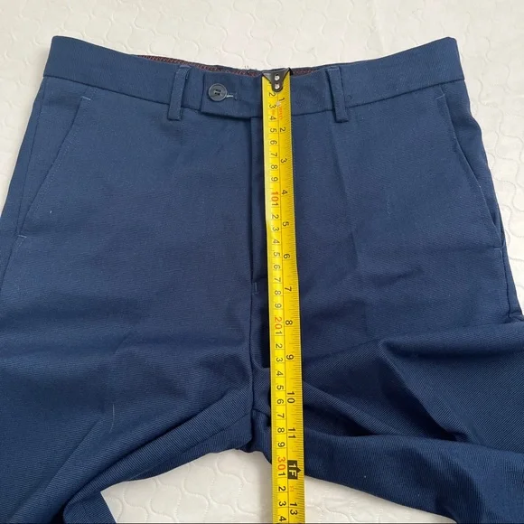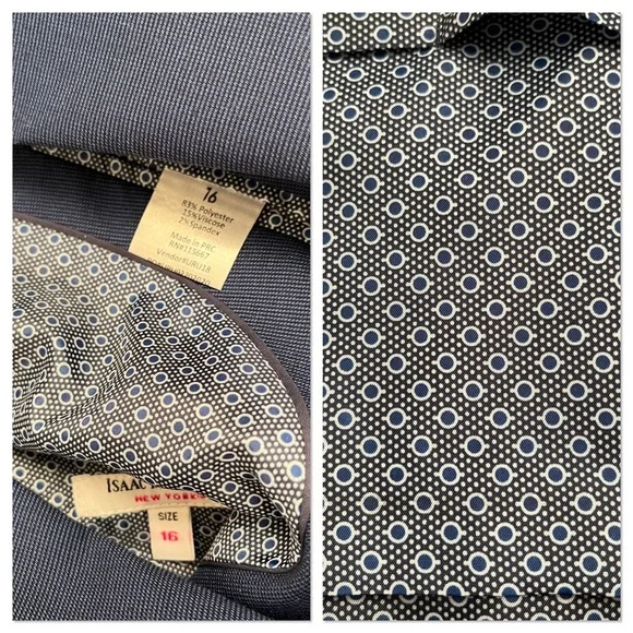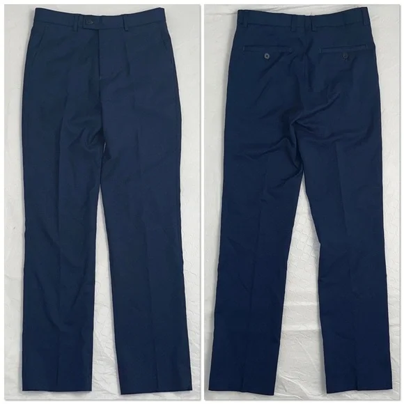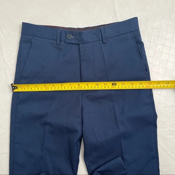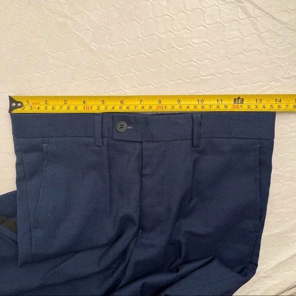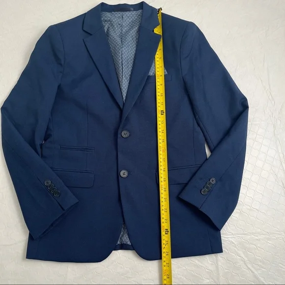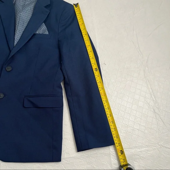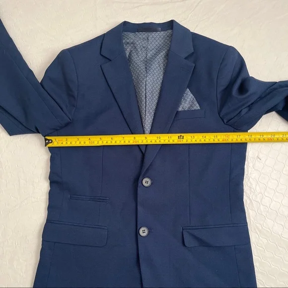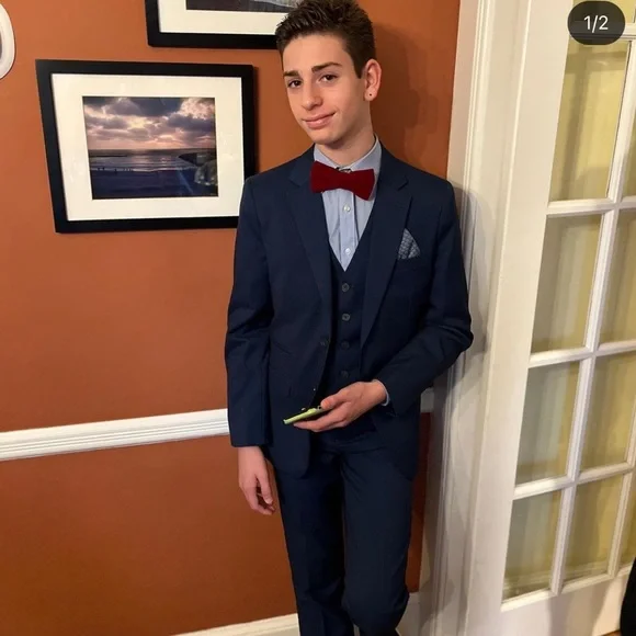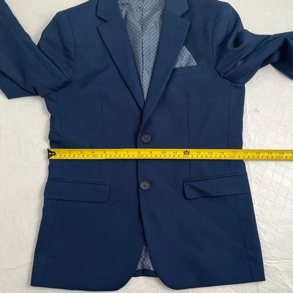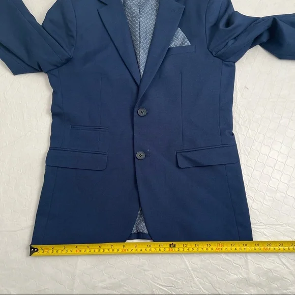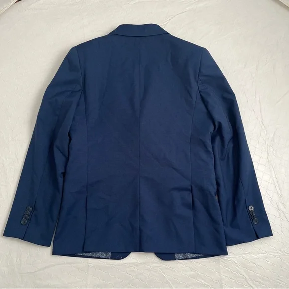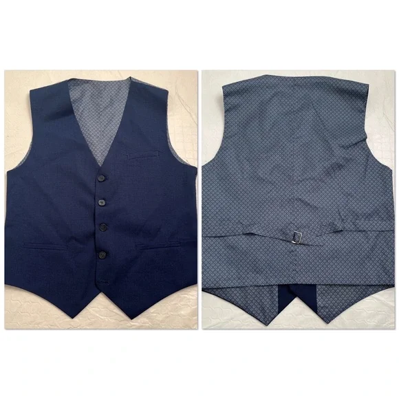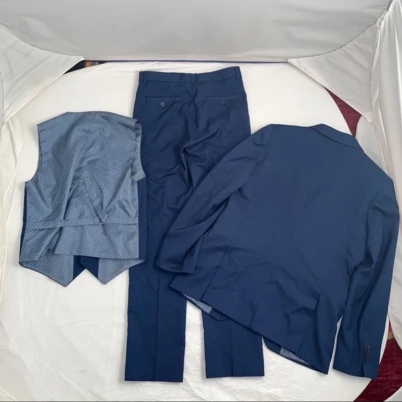 Isaac Mizrahi Birdseye blue three piece slim fit suit. Textured with a blue print satin lining. Same lining on a sewn-in pocket square and on the back of the vest. Vest has adjustable belt on back. Pattern pocket square is sewn in and matches the jacket and vest lining. Measurements in photos. Essential cool classic style for any formal dressy occasion. Perfect for bar mitzvah year! My son much prefers the look of the vest and pants over a two piece with no vest. The vest just gives that extra polished look when you’re not wearing the jacket. Excellent condition. Smoke free home.