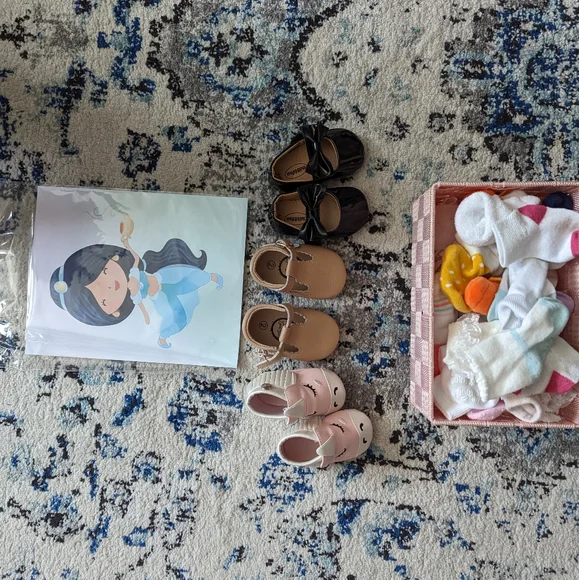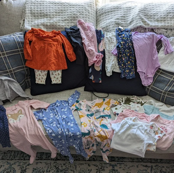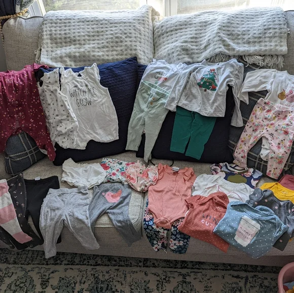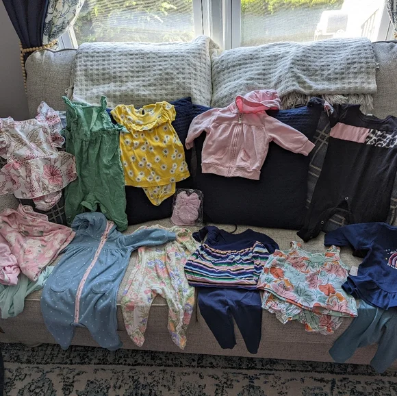 Over 50 baby girl outfits from 3 to 12 months. All outfits have gentle use or have never been used at all.Baby shoes and socks included as well.90% discount compared to retail...