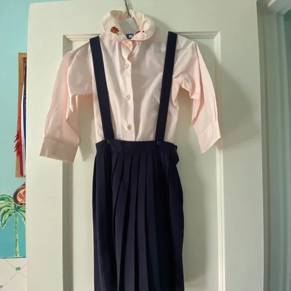 Couture avec ATTITUDEdesigner . Very special outfit for your daughter. Embroidered wool jacket with roll up sleeves.Matching long sleeve embroidered blouse on collarPleated skirt with button suspenders and side buttons.