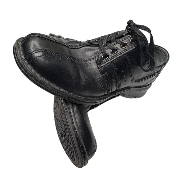 Excellent used condition! Neutral, classic, glossy black leather upper. Round toe. Lace up closure. Contrast stitch accents throughout. All photos are mine and are of the actual item. See photos for more details. Approximate heel height: flatOpen to reasonable offers!
