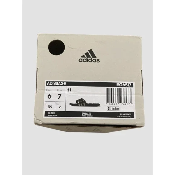 Adidas Adidsage Slides in Men’s 6 or 7 Women’s. New in box, never worn. Some box damage but slides are new. Black and Gold with adjustable logo strap.Please refer to photos for all details. Ask any questions. Smoke free home. Fast shipping.