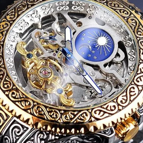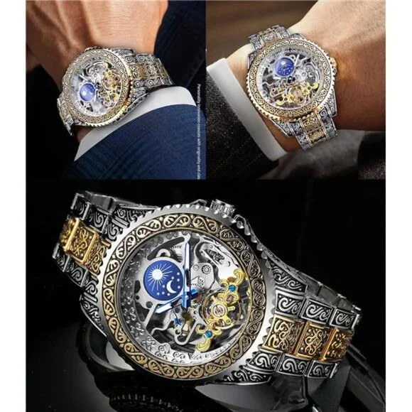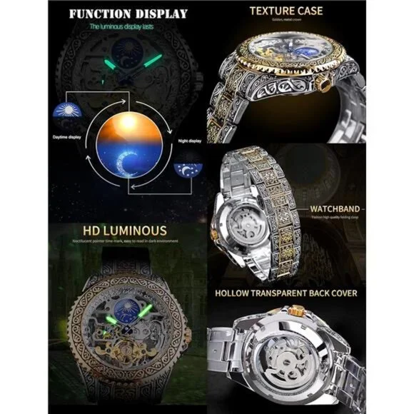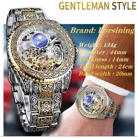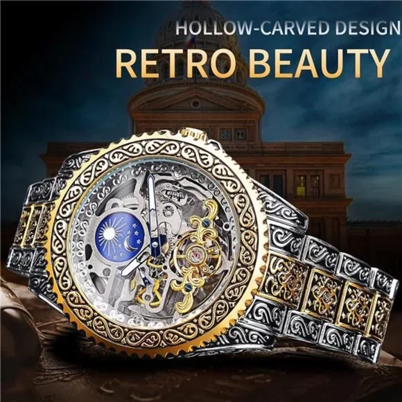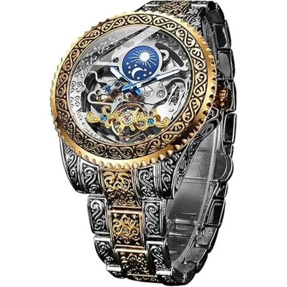 *【Vintage Design】Our gorgeous retro men’s mechanical watch adopts a unique design. The 44mm large dial uses a hollow carved decorative pattern. The Moon Phase on the top helps you to judge day and night. The gold wave-shaped Tourbillon at the bottom makes the watch more accurate. Independent second-hand reflects the designer´s ingenuity. The combination of these makes this watch extremely luxurious.*【No Battery Needed】This carved automatic watch can gain kinetic energy without using a battery. Just turning the crown clockwise 20 times can get the watch´s power for a whole day. If you are wearing it for exercise, you don’t even need to spin too much. (Please wind up fully when you use it for the first time. If you just shake the watch, it may only start for an hour.)*【Premium Movement】High-quality imported movement, quiet enough, even working at night, it will not make a lot of noise. The function of the moon phase and tourbillon can run smoothly relies on the power of the movement, which lives up to more than 10 years.*【Convenient & Comfortable】This elegant watch is equipped with an easy-to-adjust vintage engraved stainless steel strap, the luminous effection of the hands helps you to check the time even in the dark. The custom-made no easy fading case and high-hardness glass allow you to wear it for a long time.