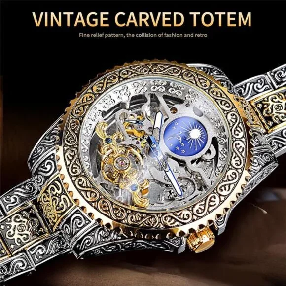 Men´s Retro Watch Carved Self-Wind Mechanical Tattoo Tourbillon, Gold