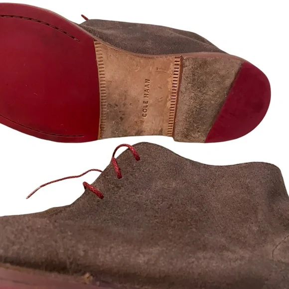 Cole Haan Dark Brown Suede Chukka Lace up Ankle BootsLace up closure. Leather and rubber outsoleCondition is Good Preowned with Signs of NormalWearComes from Smoke & Pet Free HomeBREAKERS