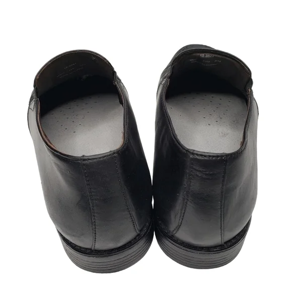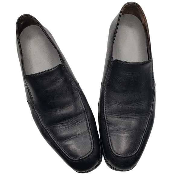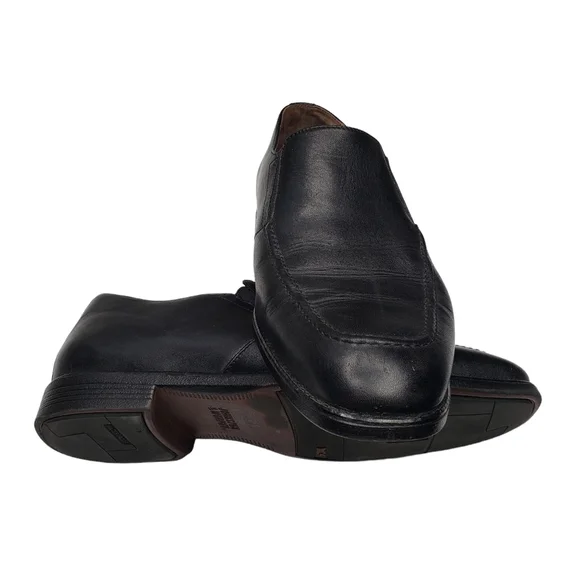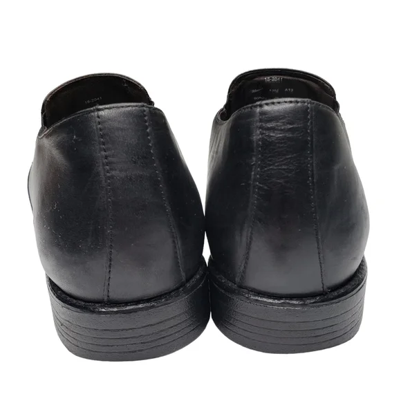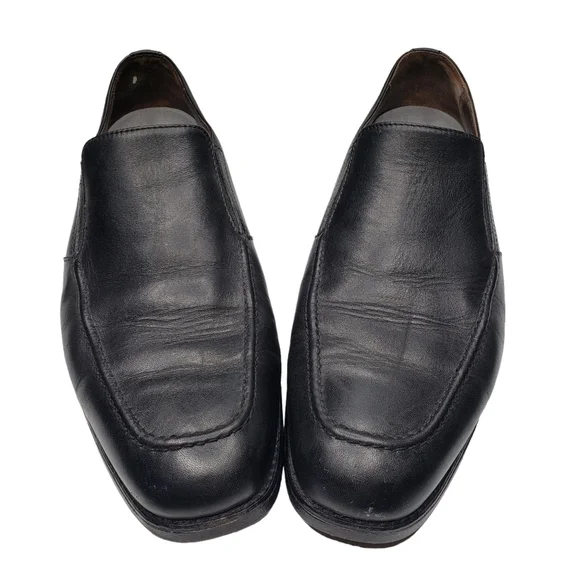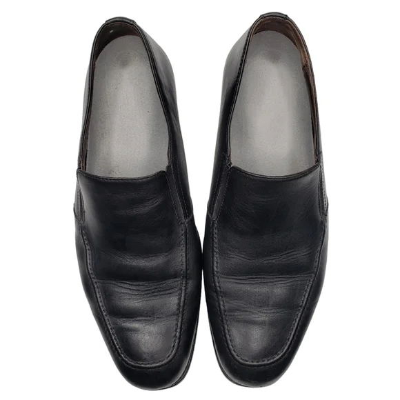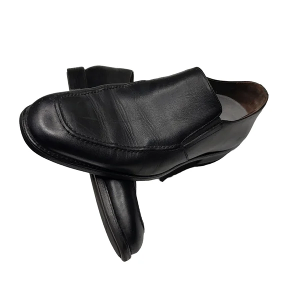 Excellent used condition! Natural signs of wear. Classic black leather upper. Slip on style with an almond toe. Business casual. All photos are mine and are of the actual item....
