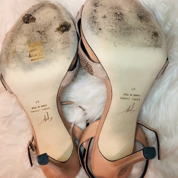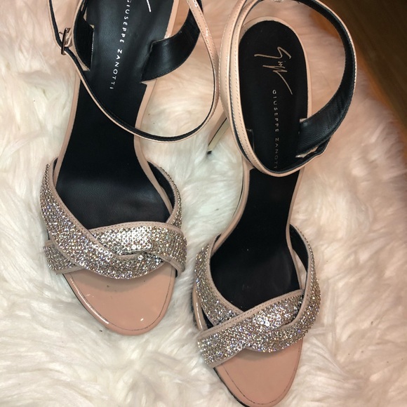 Worn only once. It is a beautiful statement heel that everyone will notice when you wear it. It sparkles even more in person.