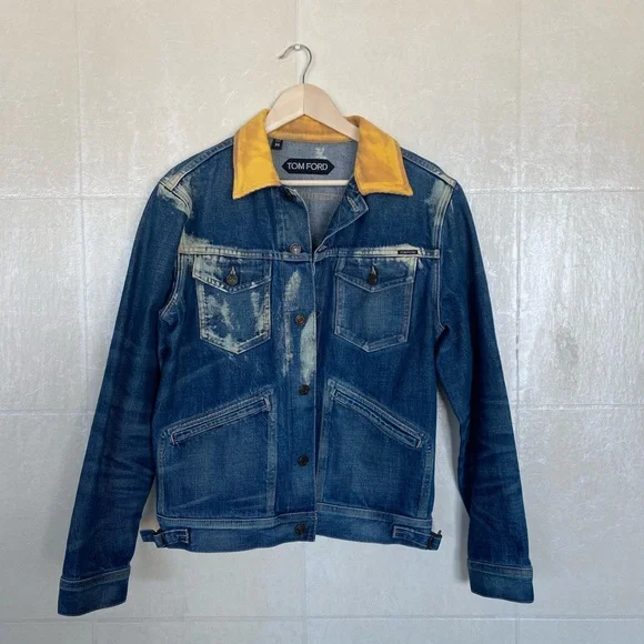 TOM FORD denim jacket featuring a bold yellow corduroy collar.• Corduroy collar• Button front• Buttoned flap chest pockets• Side pockets• Long sleeves• Single-button cuffs• Side adjusters• Made in USA