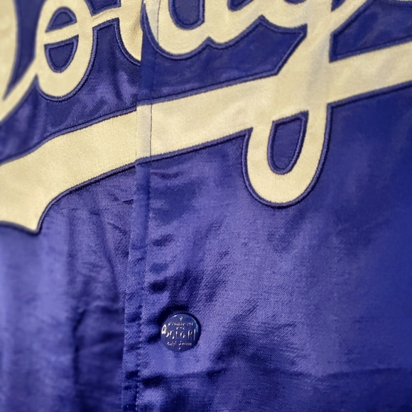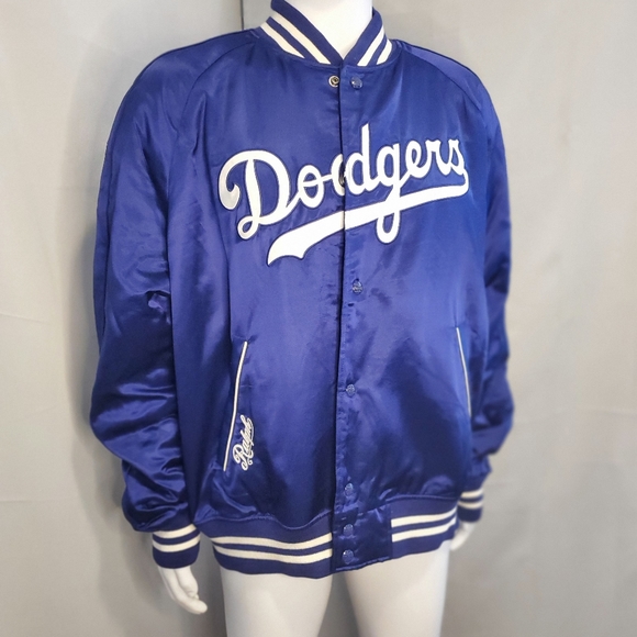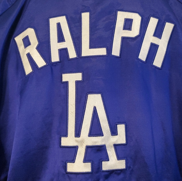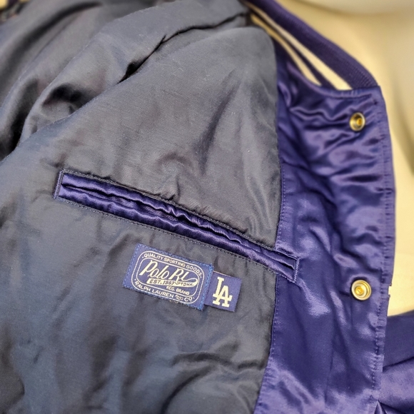 This jacket is part of the first ever Limited Release collaboration of MLB & Polo by Ralph Lauren.Striped ribbed baseball collar. Snapped placket. Long sleeves with striped ribbed cuffs. Los Angeles Dodgers™ logo patch at the center front. Two front waist angled pockets."Ralph" script embroidered at the right pocket. Interior left chest pocket. Patches spelling out "Ralph Lauren" and a Los Angeles Dodgers™ logo patch at the center back. Striped ribbed hem. Fully lined and filled.