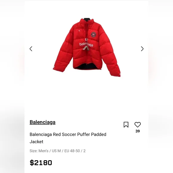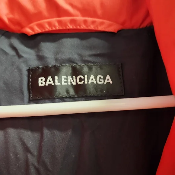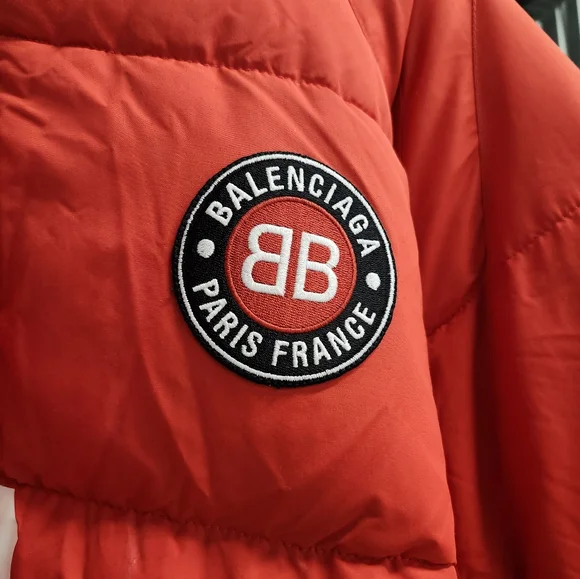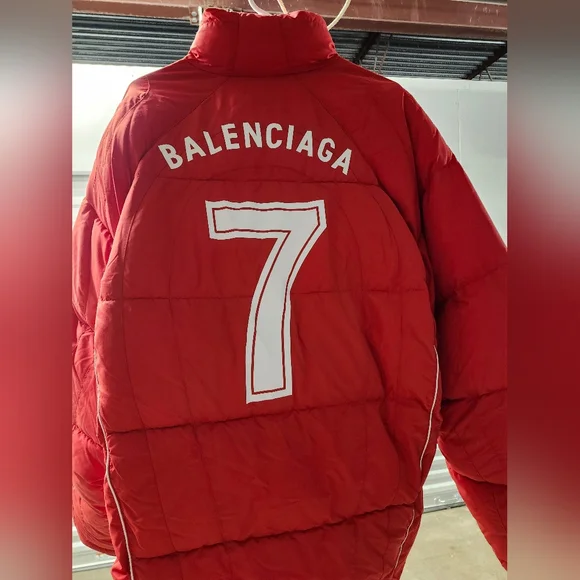 Stylish red puffer jacket by Balenciaga. Features logo detailing on the front.