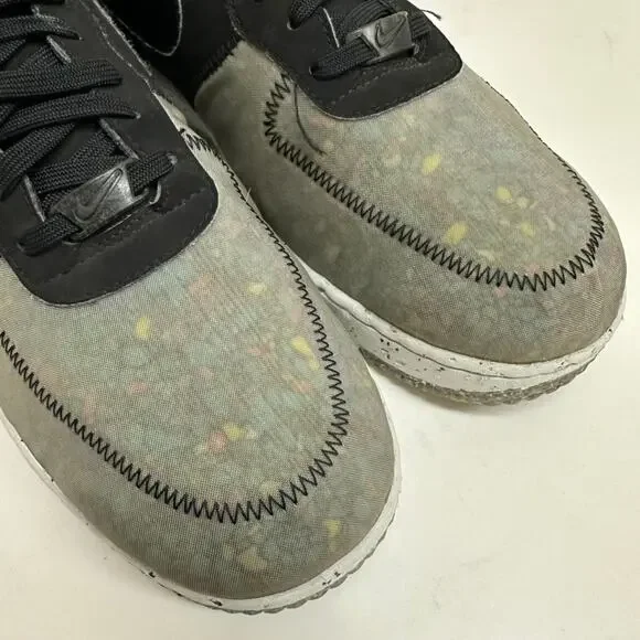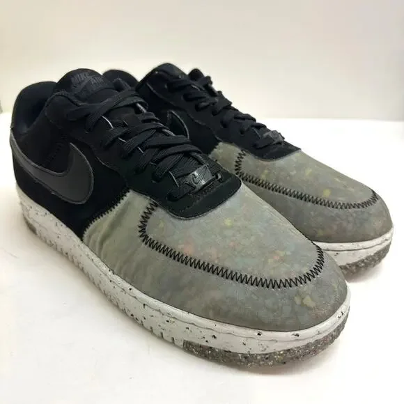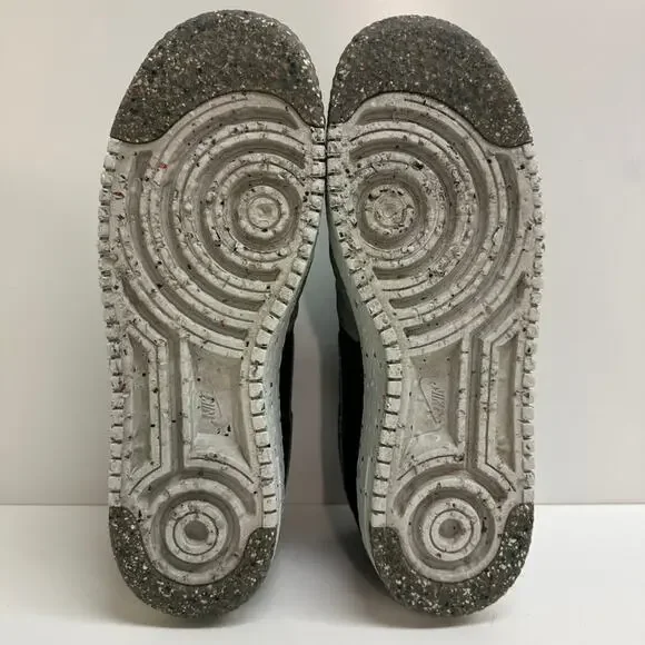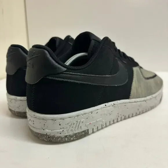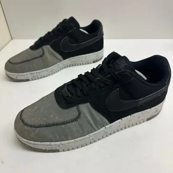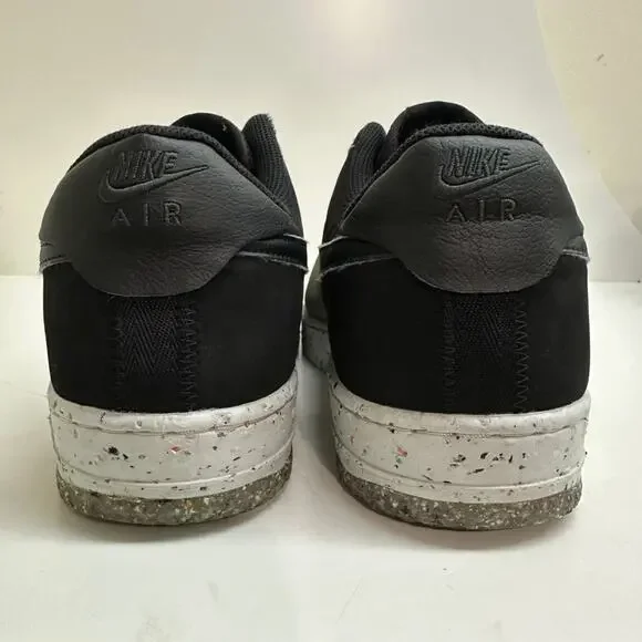 "The Nike Air Force 1 Crater Recycled Black builds this iconic silhouette using partially recycled materials and creates a shoe that is as forward-thinking as it is fashion-forward.The upper of this sustainable sneaker features recycled textile on the forefoot that has a translucent sheen that reveals multicolored pebble-like graphics underneath. The eyestays and the back of the shoe are crafted from black textiles. The heel tab and the Nike swoosh on the side panel are synthetic black leather. Black deco stitching circles the toe box and connects the pieces of the upper together. A white midsole of 11% recycled Crater Foam features colored speckles that echo the forefoot of the upper. This environmentally conscientious shoe rides on a sole of speckled white rubber and recycled Nike grind in speckled gray.Our favorite aspect of this shoe are the secret pops of yellow that land on the insoles. The Nike Air Force 1 Crater Recycled Black was released on May 13, 2021, for a retail price of $110."Pre-owned in GOOD condition; moderate wear inside right heel (as pictured)