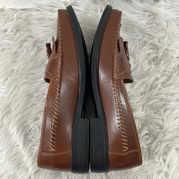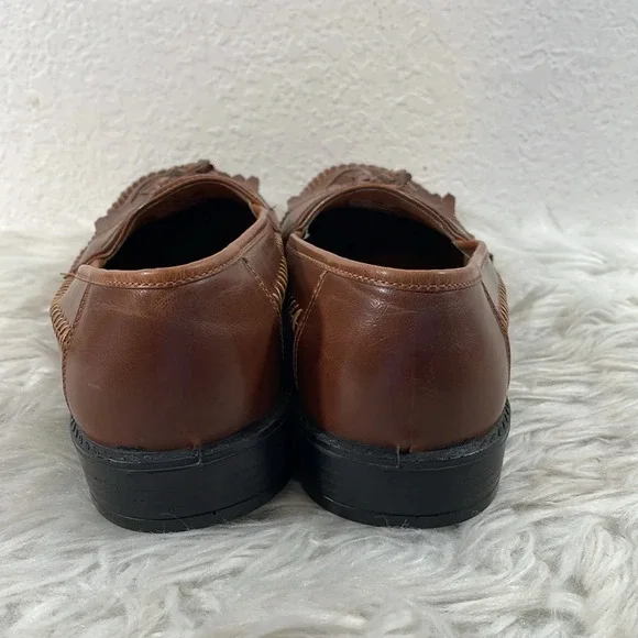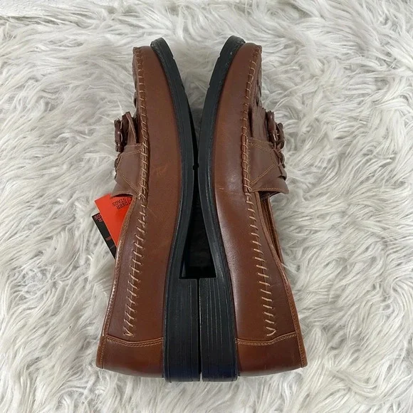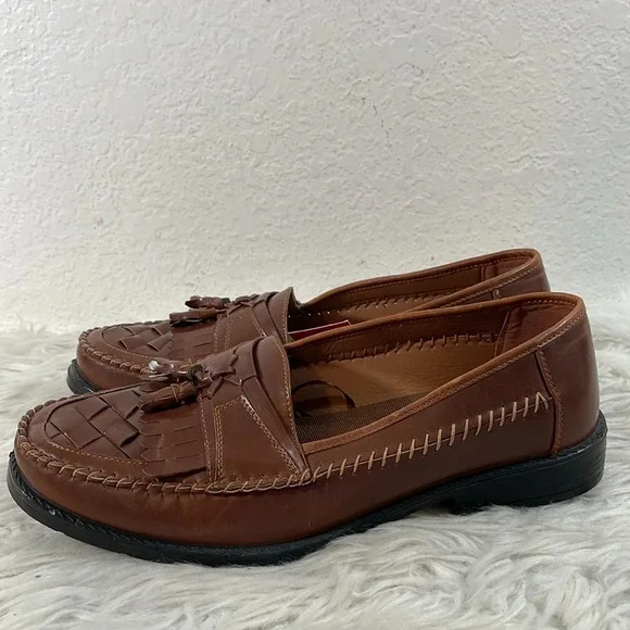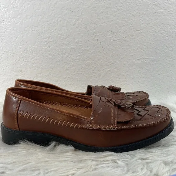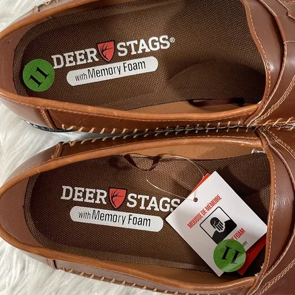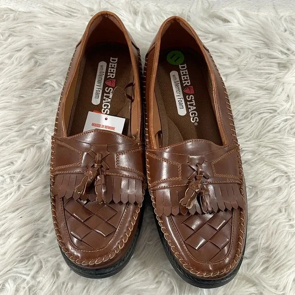 DEER STAGS HERMAN Slip On Loafer With Memory Foam Brown Size 11 The Herman loafer is a classic dress shoe that will enhance business or formal attire. These slip-ons feature a woven design at the toe and tassel accents for added texture.Deer Stags Men´s Herman Kiltie Tassel Comfort LoaferRICH DETAILS: Gorgeous craftsmanship with detailed kiltie, tassel, weaving and stitchingMEMORY FOAM INSOLE: Step in and relax! Enjoy instant relief due to memory foam’s cushioned and customized support that molds to your foot.SOFT FABRIC LINING: Wear with or without socksAFFORDABLE AND FASHIONABLE: Comfortable design at a fraction of the costThe Herman pays tribute to the time-honored kiltie tassel style, a loafer look that´s a little bit casual and a little bit collegiate. The rich simulated leather upper has a woven detail on top and eye-catching moc-inspired stitching around. The cushioned memory foam insole will make you feel like you´re walking on clouds and the sweat-wicking fabric lining makes this a great contender for wearing without socks.Faux leather upperSlip-onRound moc toeSynthetic liningMemory Foam insoleSynthetic soleNEW with Tags