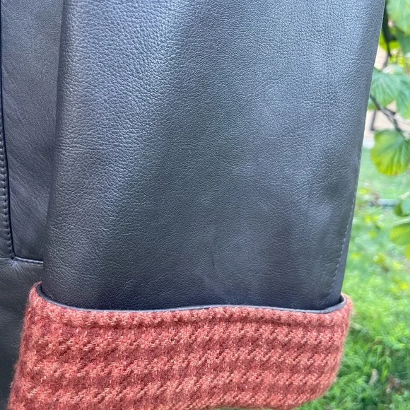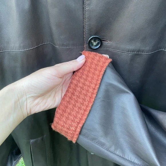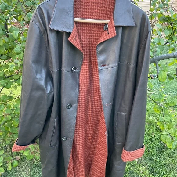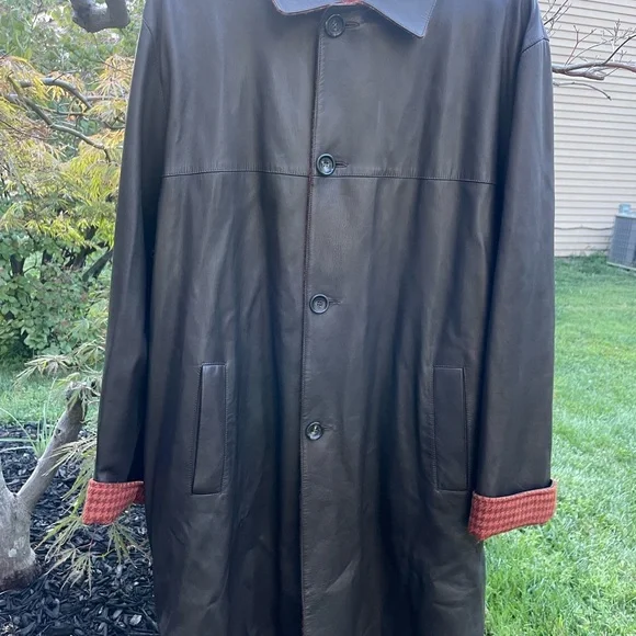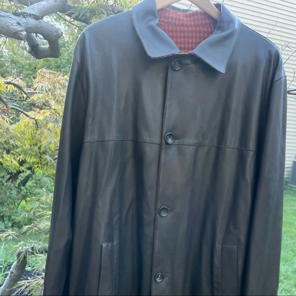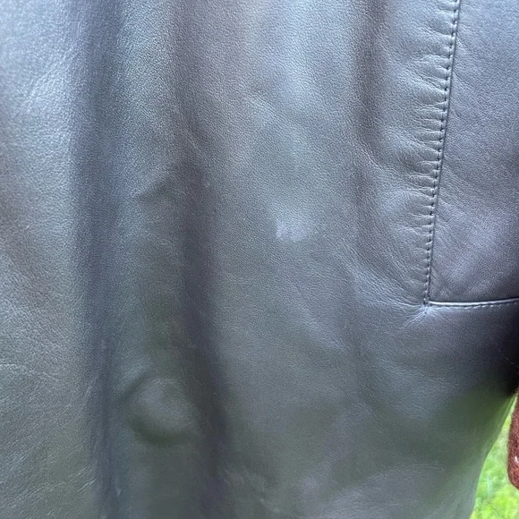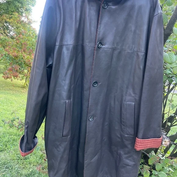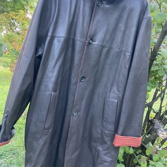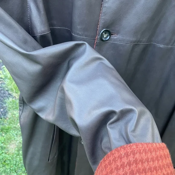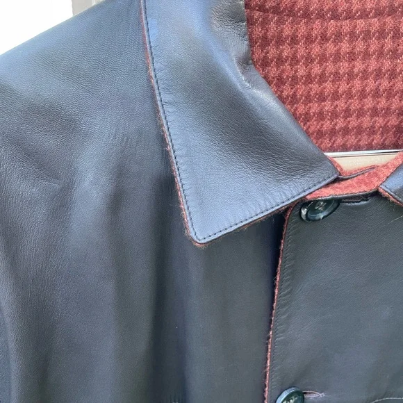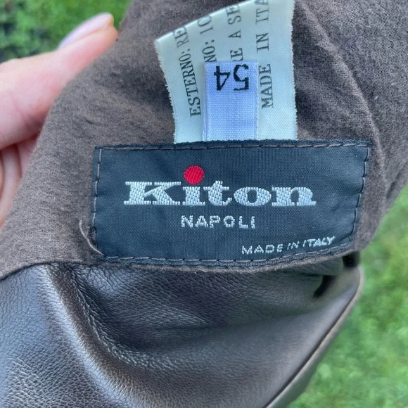 Genuine Kiton leather coat, black with buttons hand made in Italy.Size 54Little imperfection are in 2 places but easy to take them off.