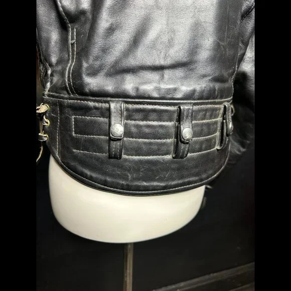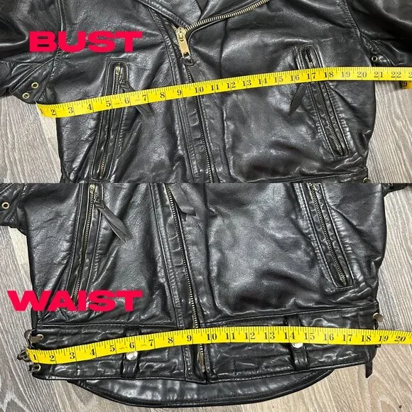 This mid 1960´s piece is in remarkable condition for it´s age! All original zippers and snaps function perfectly. The cotton pocket linings are clean (including the inside pocket). The leather is still pliable without any age stiffness. The lining appears to be in flawless condition. I noticed some minimal vertigris on the brass hardware. Adjustable tie sides. No abnormal or smoking odors. We purchased this piece with the belt shown and it will be included however we are not positive that it is original to this jacket. A stunning piece of American motorcycle culture. size is estimated. measurements are shown in the photos.Here is some information from Langlitz (from a sold listing of the exact same model)“Wow, that’s a beauty!My gut says that that Columbia was probably built in the early to mid-1960’s. I’m not seeing many hints that it’s horsehide. It’s probably cowhide with maybe a panel or two in horsehide. During that transitional period in the late 50’s early 60’s as horses were relegated to the 4H club, and beef became king! So the transition was from black leather, to black leather, as far as Langlitz Leathers was concerned.I would say that your best indicator of what hide it is, would be how well it keeps you dry. Does water tend to go right through it? Or do you stay dry for a long time, until the thread wicks the wet inside?