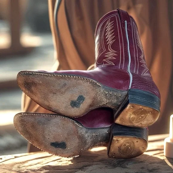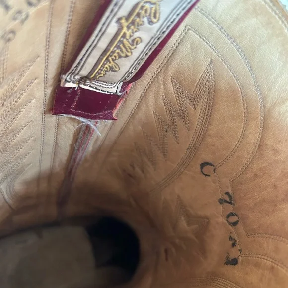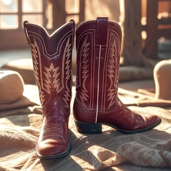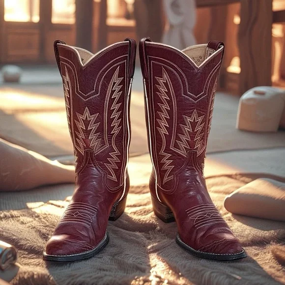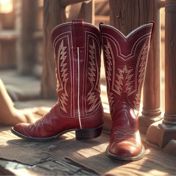 1970s Larry Mahan Cowgirl Boots – Women’s Size 7 These vintage 1970s Larry Mahan cowgirl boots in women’s size 7 showcase classic Western craftsmanship with a bold, deep red leather exterior. The intricate white stitching along the shaft and vamp highlights a striking, traditional design. Built for durability and comfort, they feature a snip toe, stacked heel, and pull tabs for easy wear. The soles show signs of wear, adding to their authentic vintage character. A rare find for collectors or anyone looking for a timeless Western boot with history. Size: Women’s 7Condition: Vintage, well-worn soles, structurally solidMaterials: Full-grain leatherFeatures: Snip toe, stacked heel, pull tabs, intricate contrast stitching
