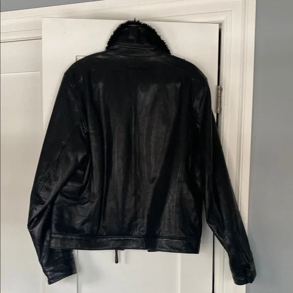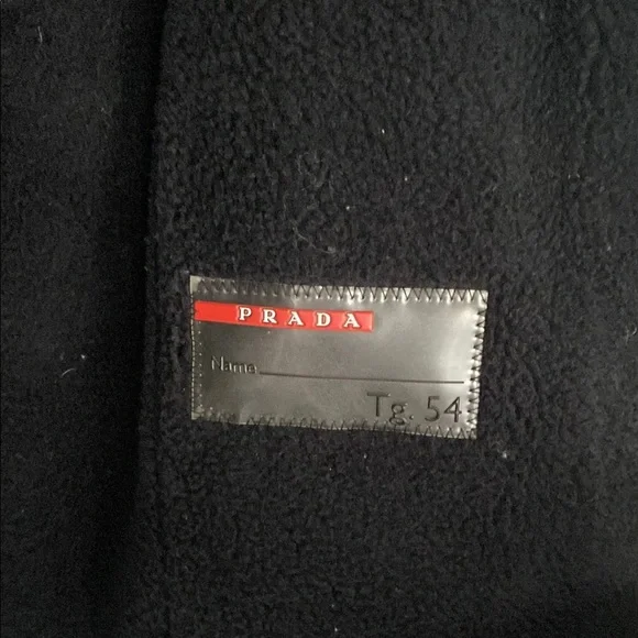 This Prada bomber jacket showcases a sleek black leather design with a smooth finish. It features a prominent collar that adds a touch of sophistication, while the slim fit...