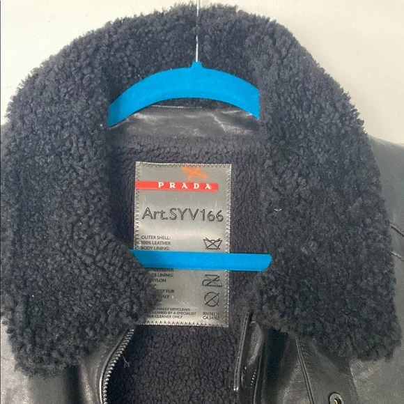 This Prada bomber jacket showcases a sleek black leather design with a smooth finish. It features a prominent collar that adds a touch of sophistication, while the slim fit silhouette enhances its modern appeal.