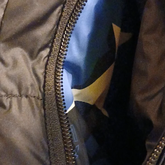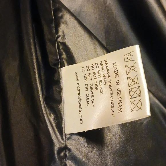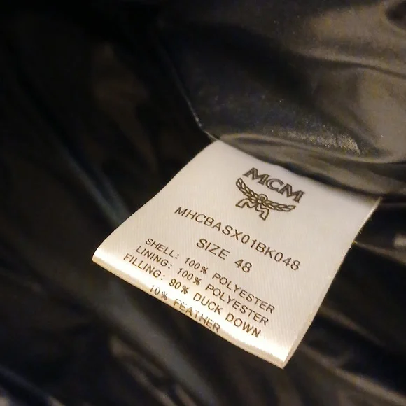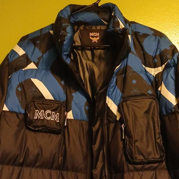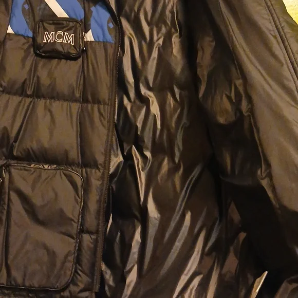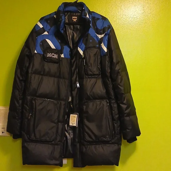 Stand out in this authentic MCM men´s puffer jacket, featuring a bold design that combines luxury with practicality. With its striking black, blue, and white color palette...