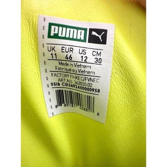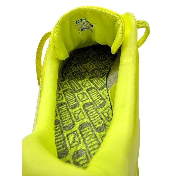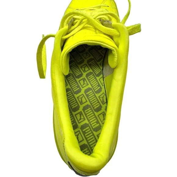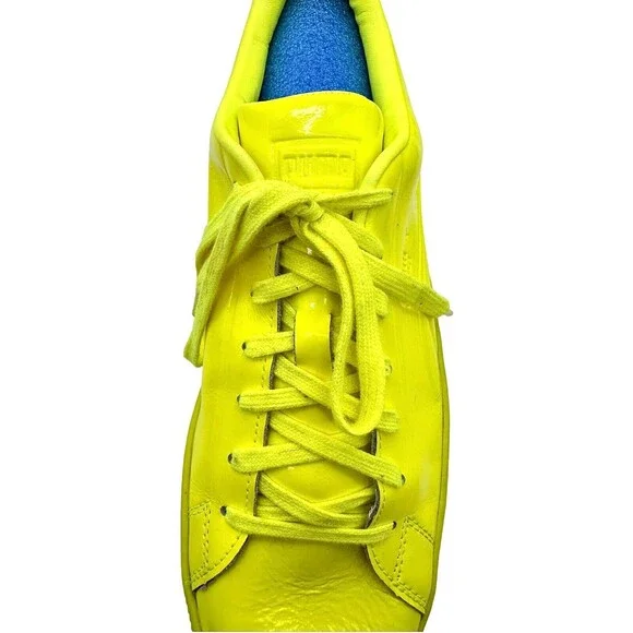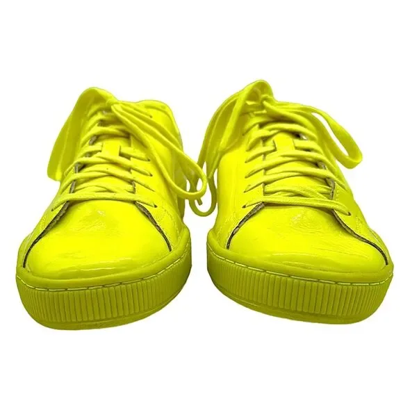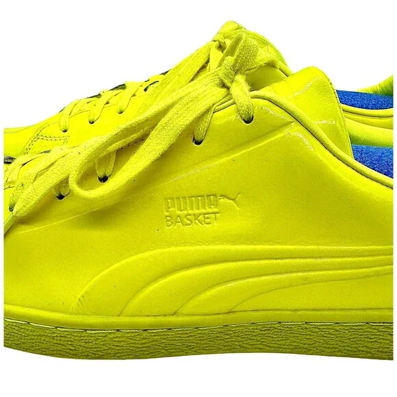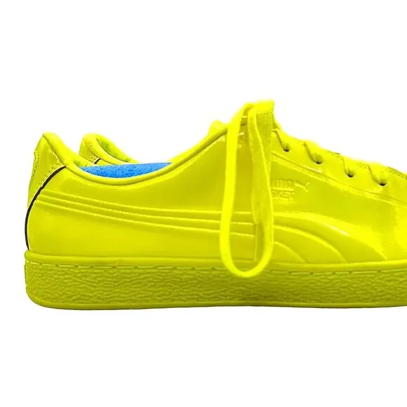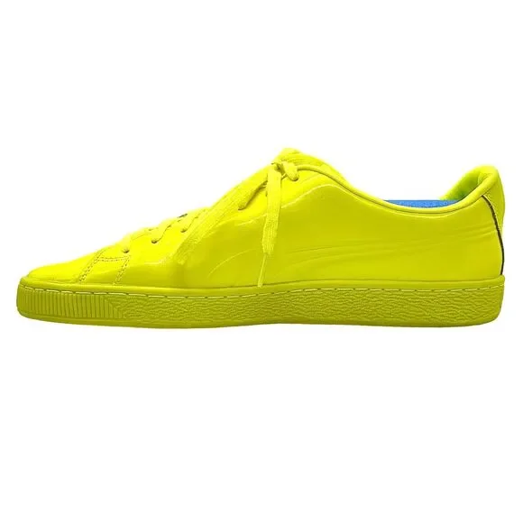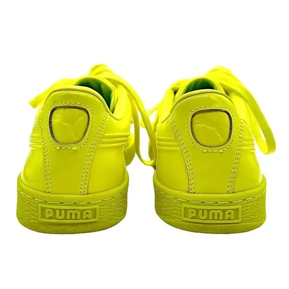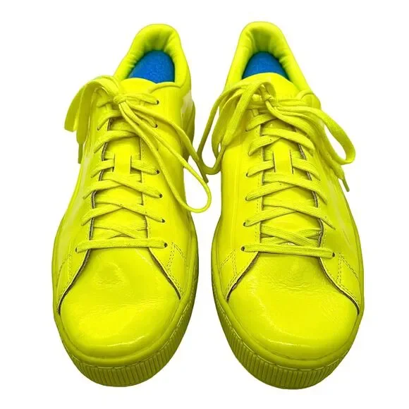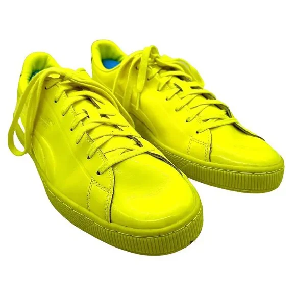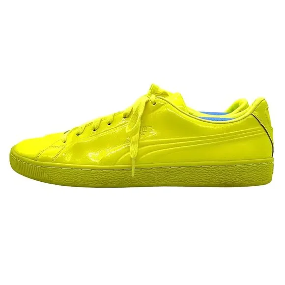 Adidas Basket Classic Patent Emboss Sneakers.Men´s size 12.Safety (neon) Yellow color.Patent leather exterior.Embossed Puma logo on sides.Lace-up closure.Very clean! Lightly worn.See photo´s for condition and details.Sold As-Is.Approximate Dimensions: 12.75" long, 4.5" wide toe, 4.5" tall.We kindly remind you that some items may exhibit natural signs of wear or fading, reflective of their use. However, we assure you that any noticeable imperfections such as stains or holes will be noted in the description. Please be aware that the actual color(s) of the item may differ slightly due to factors such as lighting conditions, photography techniques, and variations in monitor or mobile screens.