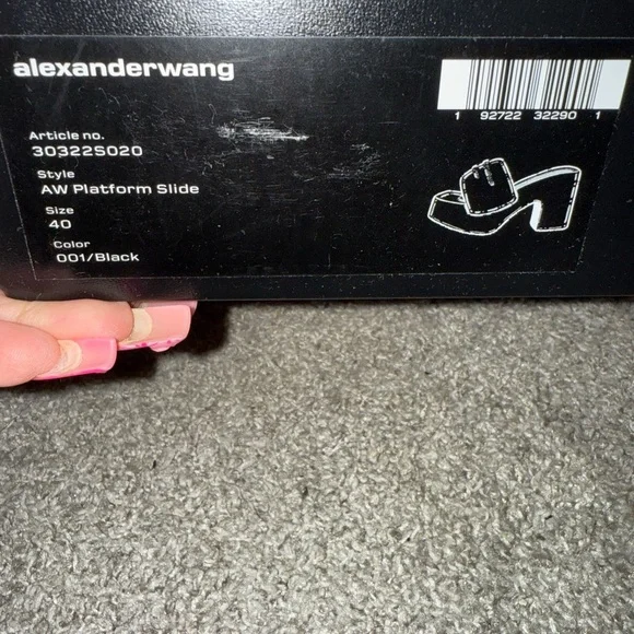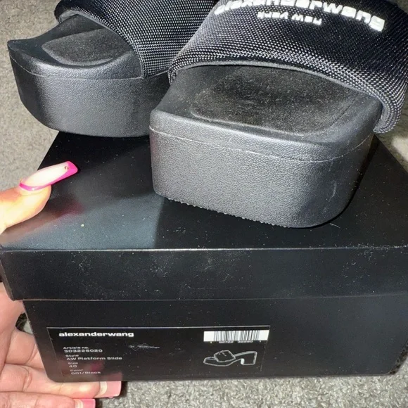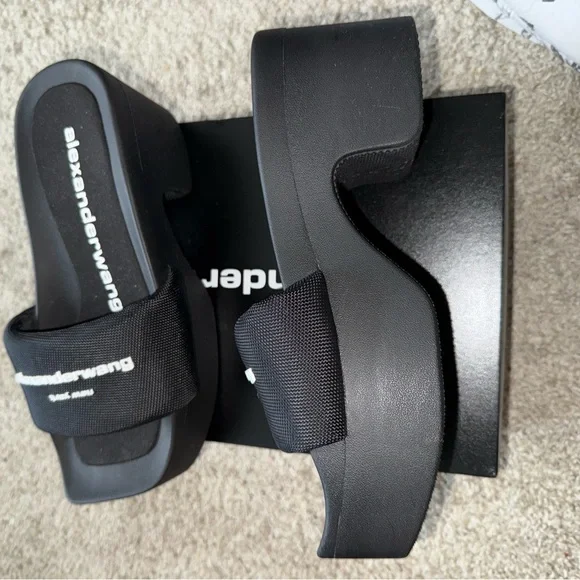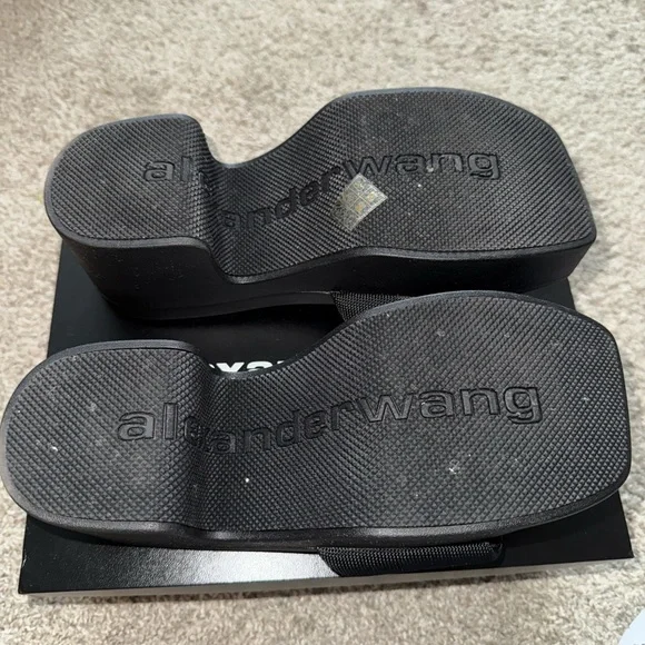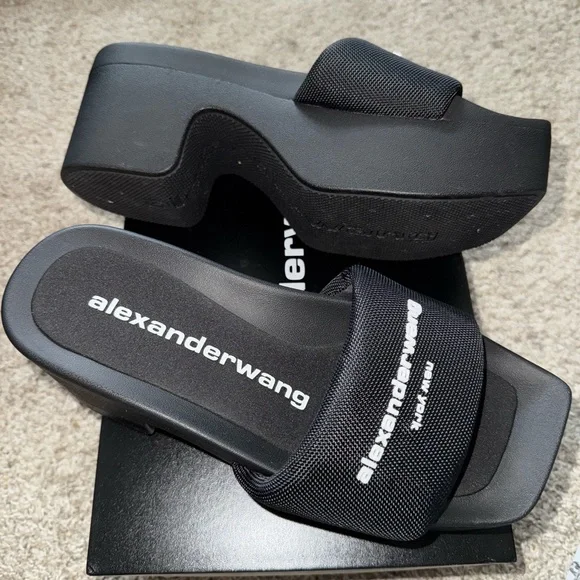 Stylish black slide sandals with Alexander Wang branding. Perfect for casual wear.