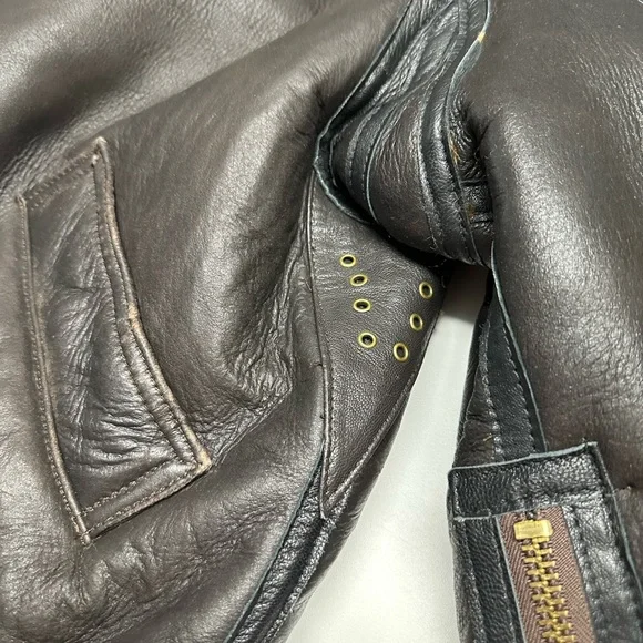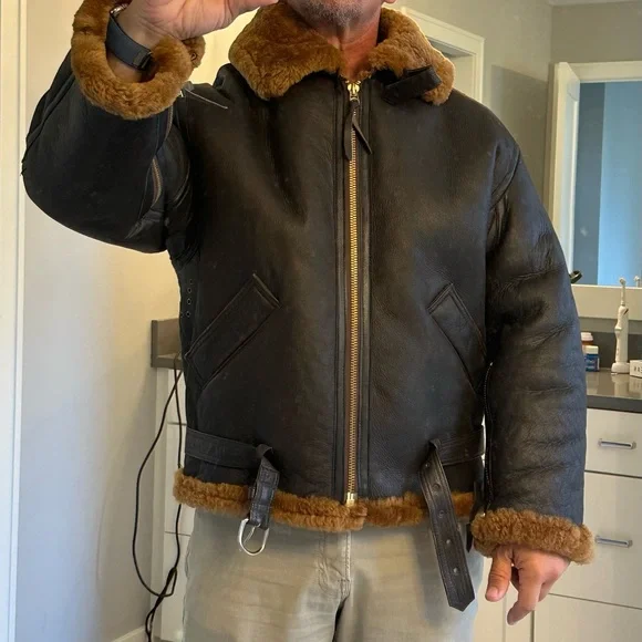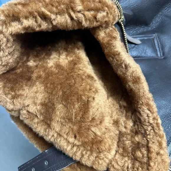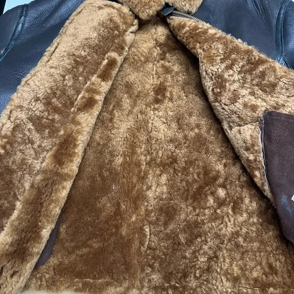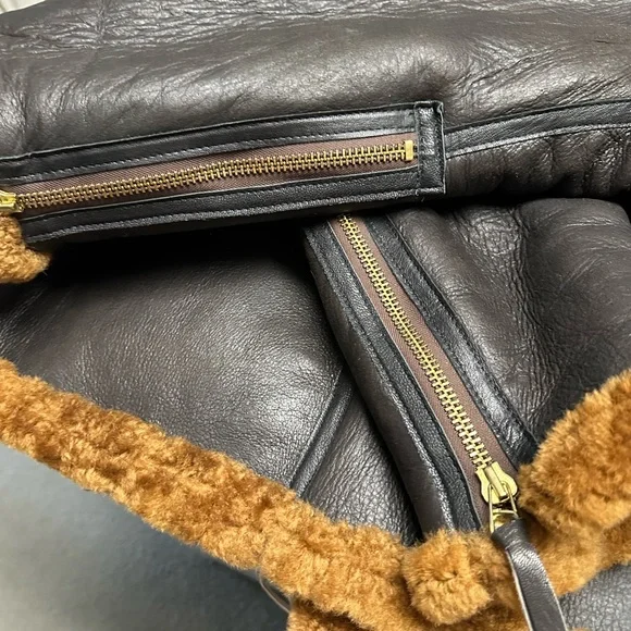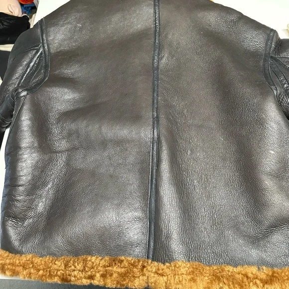 This is a unique and special bomber jacket made with high-quality brass zippers and sheepskin and leather construction with gusted under arms. This is extremely well crafted, leather bomber jacket worn by RAF pilots during the war to stay warm up in the sky while battling the Germans.It has been worn twice.It wears true to size.From Flightjacket.com