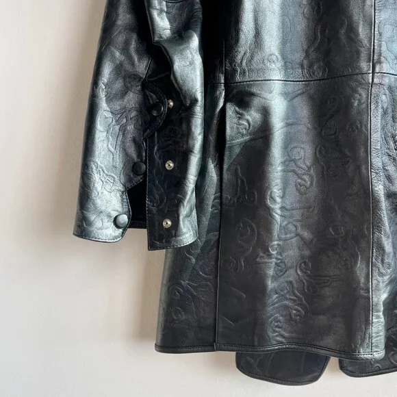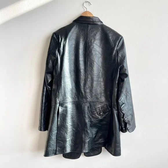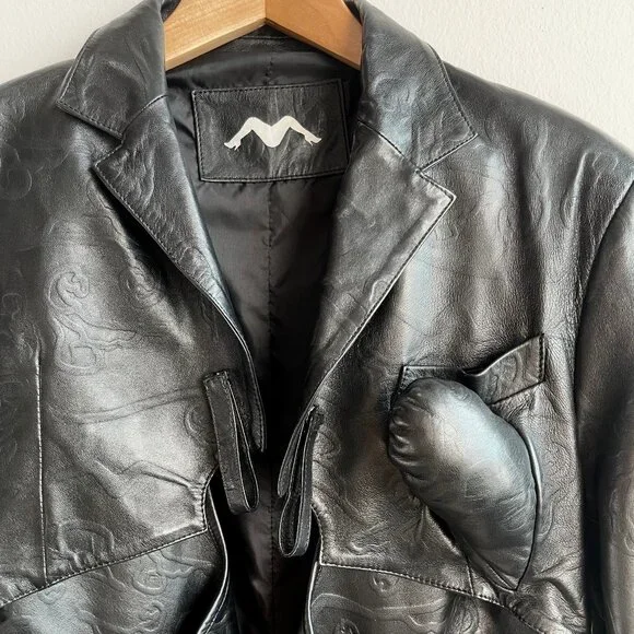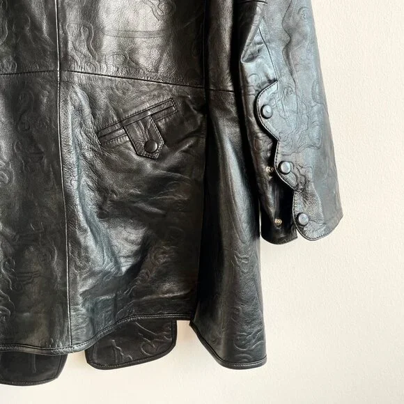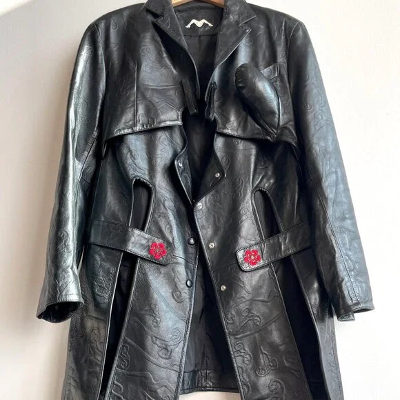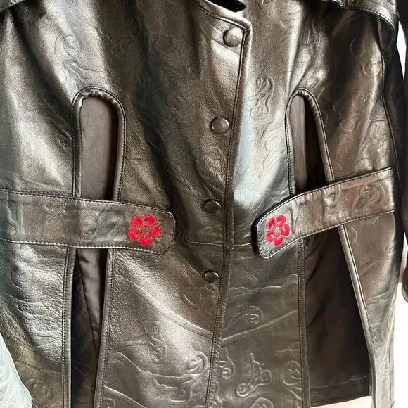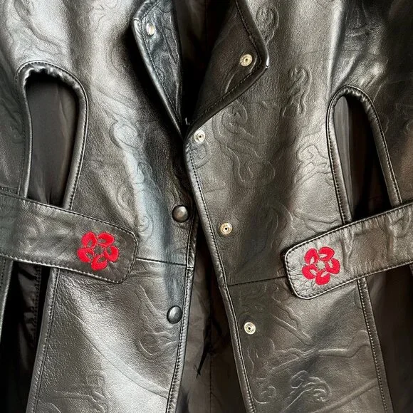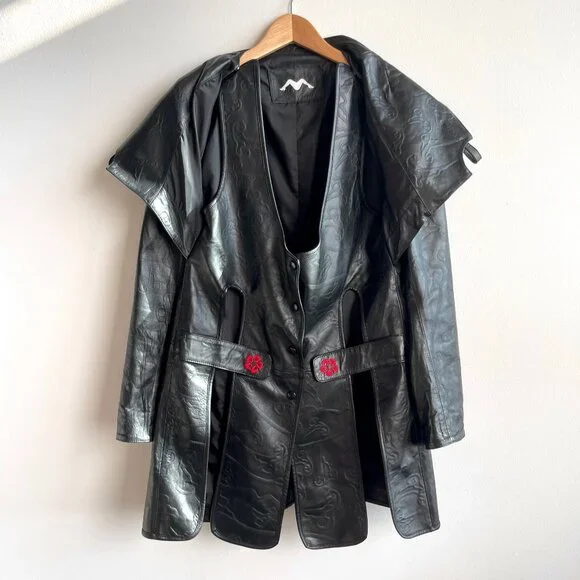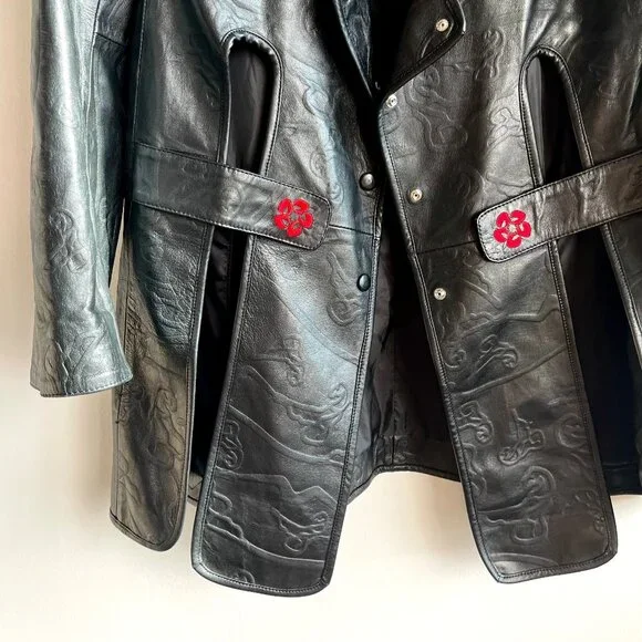 SANCHEZ KANE Leather Jacket [Size M]Condition: Like New, no flawsEmerging designer, rare item!!Printed black leather jacket with adjustable fit featuring an underlayer "vest" that snaps inRed embroidered logo "flowers" on frontScalloped edge sleeves with button snapsComes with TagSize M