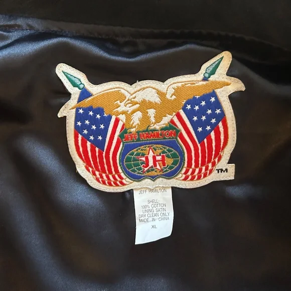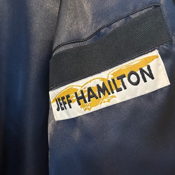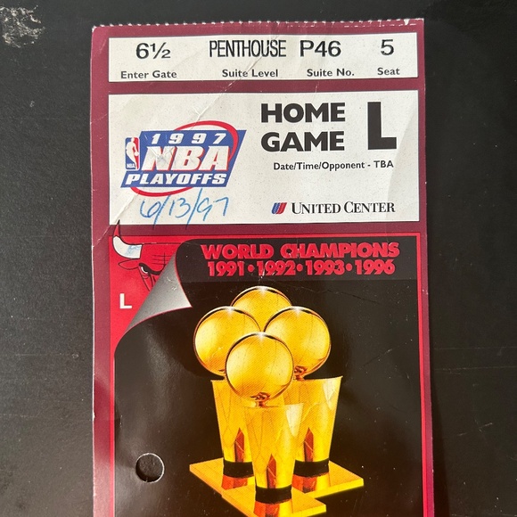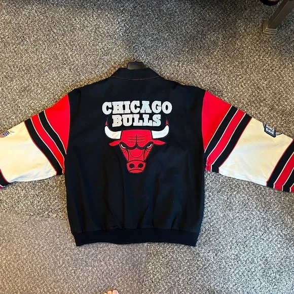 This Vintage NBA Eastern Conference XL Jacket was purchased in the United Center Madhouse Team Store and never wore. It was purchased in 1997 on June 13 the night Michael Jordan and the Chicago Bulls clinched the 5th championship against the Utah Jazz at the United Center in Chicago which i attended .This NEW CHICAGO BULLS Brushed Twill Commemorative Jacket has Embroidered Logos on the front,back and sleeves of the jacket. It was designed and made by the legendary designer Jeff Hamilton who is best known when he began to design hand-embroidered, “unapologetically loud” logo leather jackets featuring bright colors and oversized graphics. He is credited for popularizing the NBA championship leather jacket style which permeated popular culture throughout the late eighties, nineties and into the early 2000s.The Shell Is a Brushed Twill and the Lining is Satin. Comes with the original Jeff Hamilton Garment Bag AND AS A BONUS, YOU GET MY ACTUAL TICKET STUB TO THAT CHAMPIONSHIP GAME!Officially Licensed Jeff Hamilton Brand,Made in USA,Size is XL