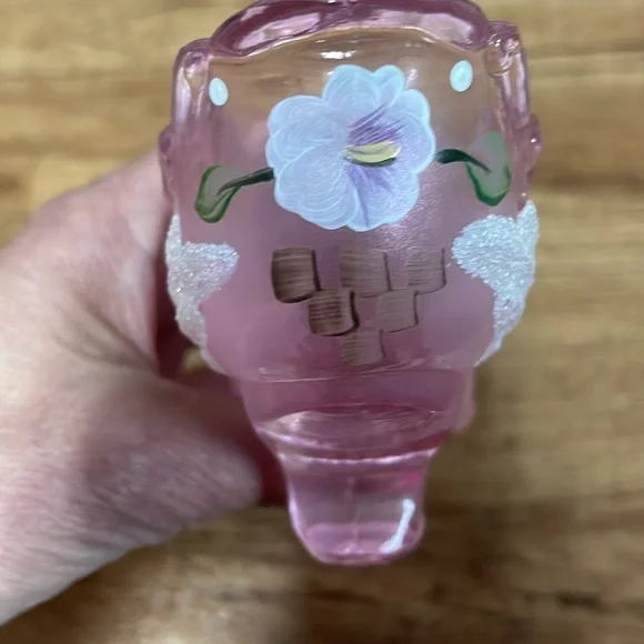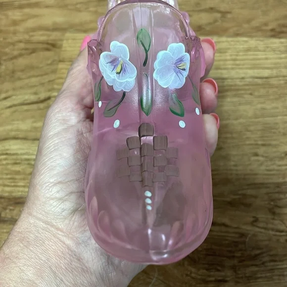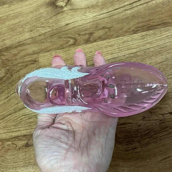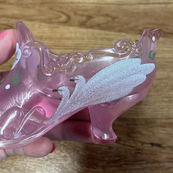 Fenton Iridescent Pink Slipper with Hand Painted Swans larger size 7” long