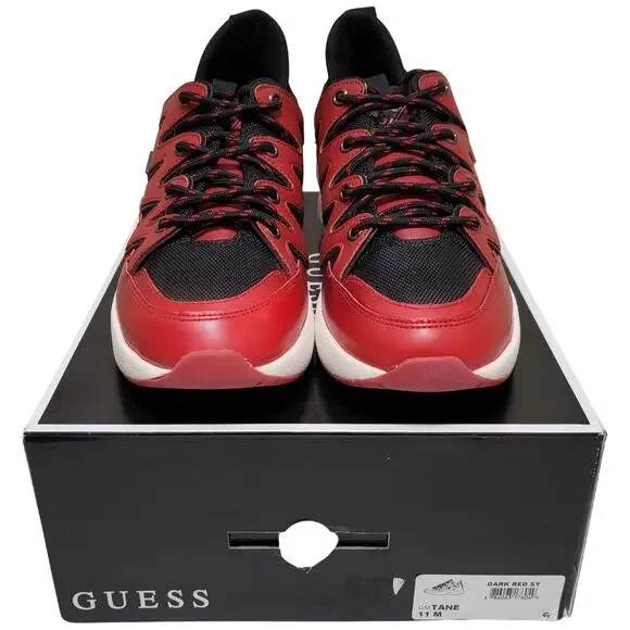 Guess Tane Men Chunky Platform Dad Sneakers Size US 11M Dark Red Faux LeatherNew with boxFlashed in sporty lines and a chunky platform, the street-savvy fashion sneakers from GUESS add active lift to casual looks.Round-toe lace-up sneakersMetal eyelets at lacesPadded collar and padded tongue for added comfort; water-resistantSynthetic upper; synthetic lining; rubber soleImported