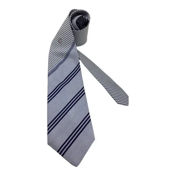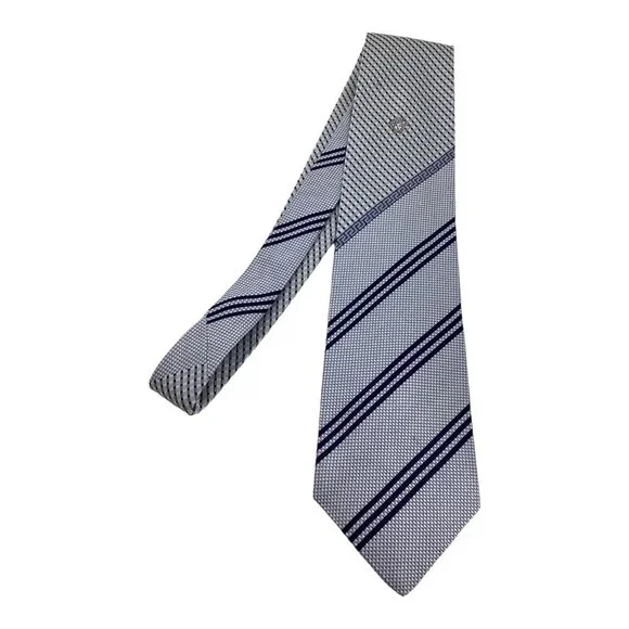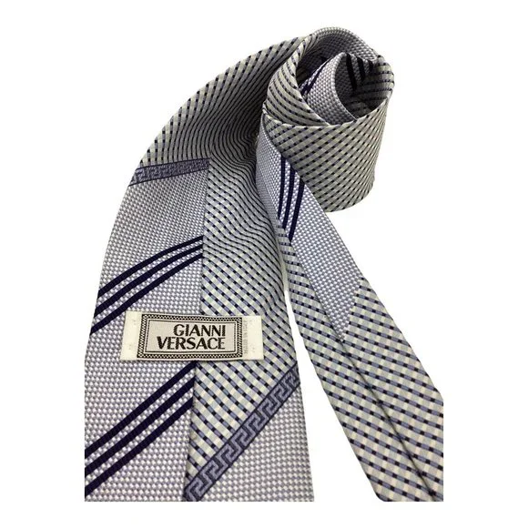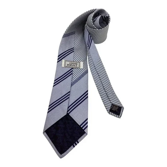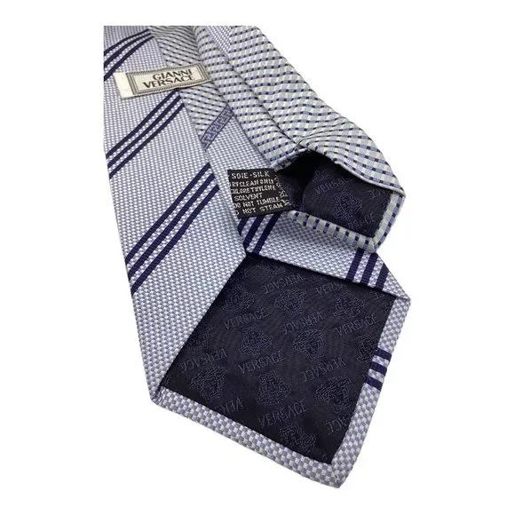 GIANNI VERSACEMade In ItalyColor: Light Blue Striped Geometric TieMeasurement: 59"- 3.75"Material: 100% SilkPre-owned In Good ConditionHello & Welcome to My Store - Luxury Ties and Much MoreAll my listed items are guaranteed 100% genuine and authentic so please bid withconfidence!My items come from a smoke-free &pet-free homeThe description of my items are accurate and precise.Please note that due to various factors (lighting, monitors, etc.), thecolor appearance/shade you see in photos may sometimes vary.If you haveany questions, please contact me. I will respond promptly. Your satisfaction isguaranteed and my flawless positive feedback attest to that.Please visit my store (Luxury Ties and Much More) and “save” me. Check back often as I offer a large choice of items for men and women posted daily.