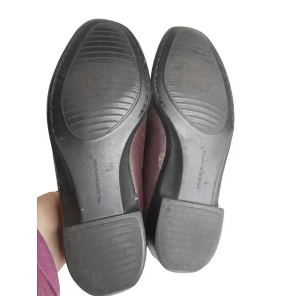 Pair of pre-owned Florsheim Loafers Moc Toe Round toe slip onsno indication of what material is, feels like leather but no guaranteeSize 7.5 D - has a stretchy piece under the...