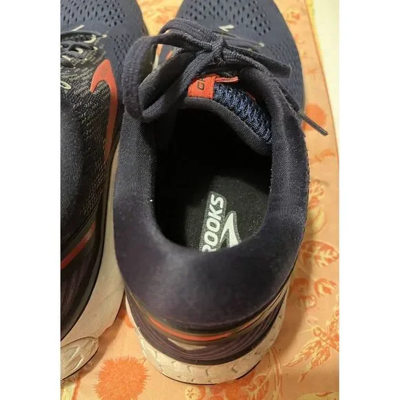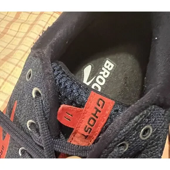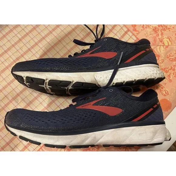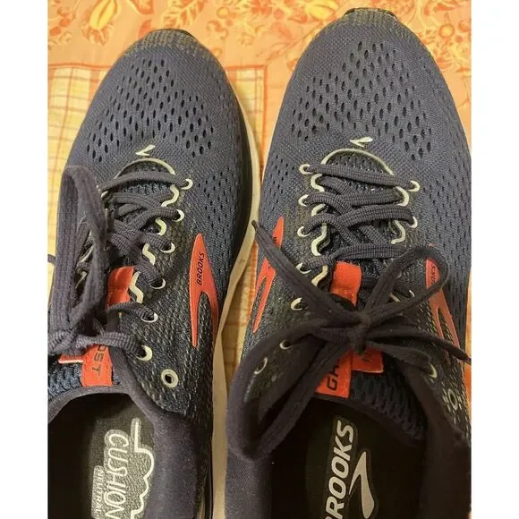 Brooks Mens Ghost 11 1102881D428 Blue Red Running Shoes Sneakers Size 12.5 D.Some road dirt coloring on the soles and some pilling on ankle area (left esp.), but overall in good pre-owned condition.