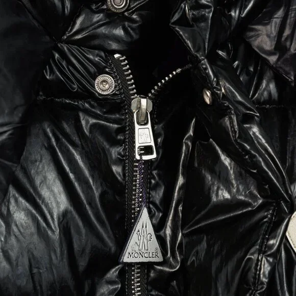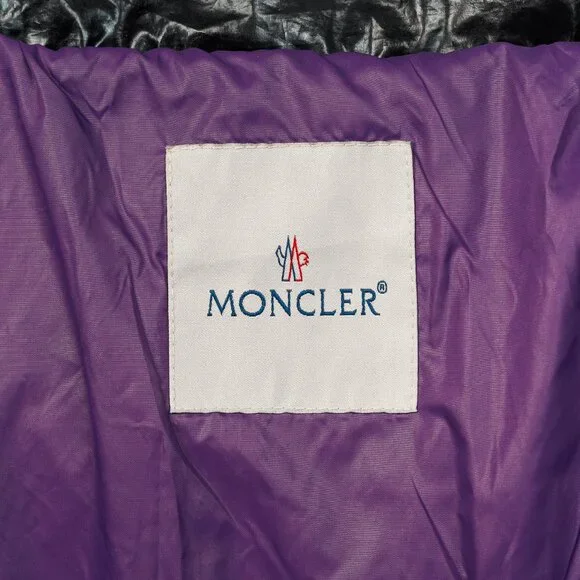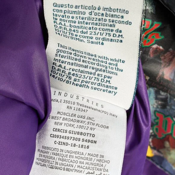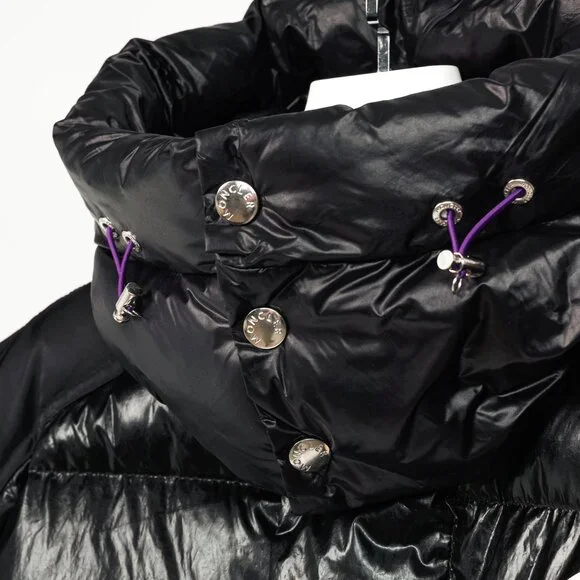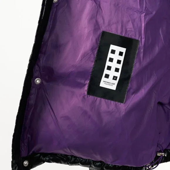 Made in Ungheria, the Tim jacket from Moncler 8 Palm Angels´ 2018 Autumn and Winter collection is crafted in shiny Black nylon quilted throughout, and is insulated in a soft down. It features long sleeves, striped ribbed cuffs with snap-closure tabs, a mock neck with a detachable hood, a front zip closure with a snap-closure placket, front snap-closure welt pockets, a drawcord hem, fuzzy logo patches on the back and front with studding on the back, Size: 4 (XL)Condition: Excellent; light spotting on sleeves, light signs of wear on shell, some pilling on inner ribbed cuffs.Approximate Measurements (laid flat):Shoulder: 22.5" (57 cm)Chest: 27" (68.5 cm)Length from back: 28.5" (72 cm)Sleeve length: 27.75" (70.5 cm)Composition: Exterior: 100% nylon. Lining: 100% nylon. Filling: Duck down (90% down, 10% feather).