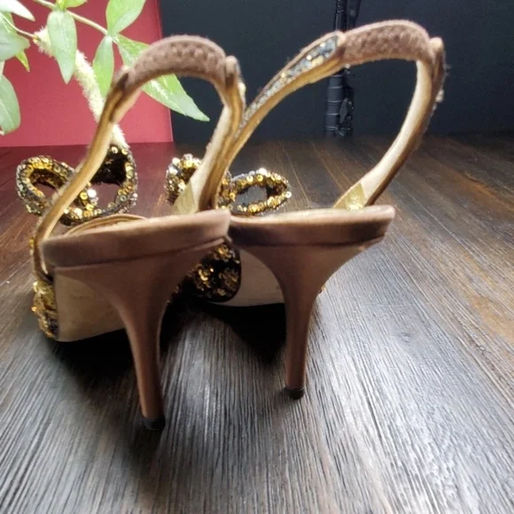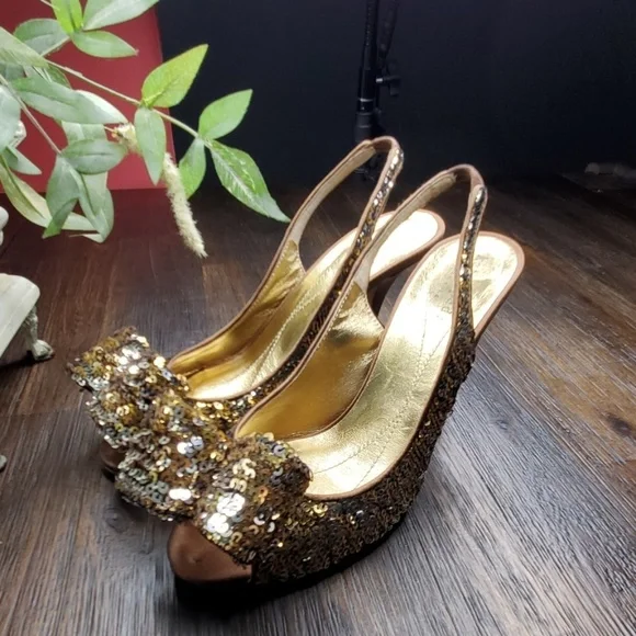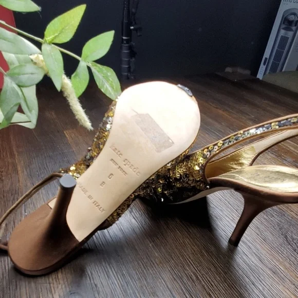 Gold Carly Gold/Silver Sequin Chocolate Satin Slingback Bow Pumps 6Kate Spade Carly Gold/Silver Sequin Chocolate Satin Slingback Bow PumpsSize:6Heel height approx. 4"Peep toeBow...