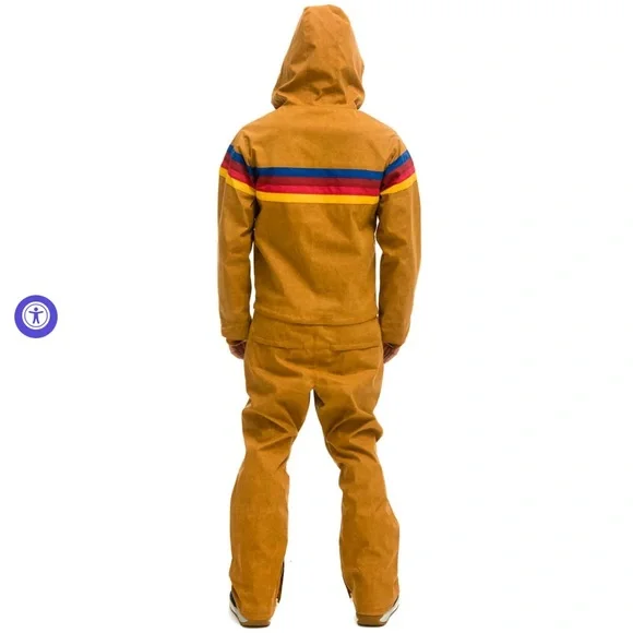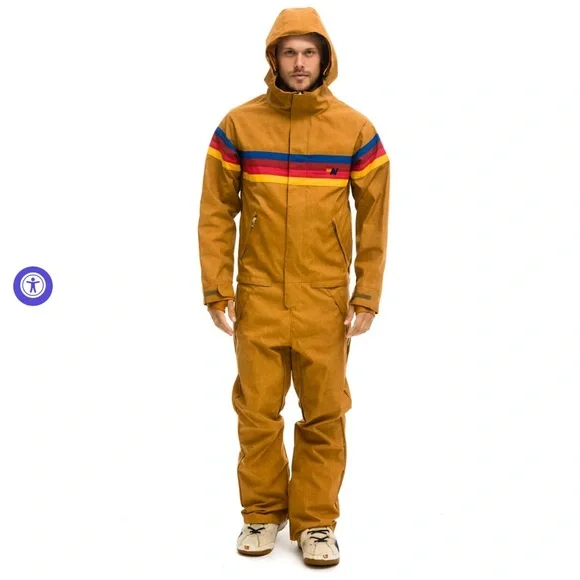 Stay stylish and comfortable with this khaki hooded powder suit featuring vibrant multicolor stripes. Perfect for any day on the mountain. Made in the USA. New with tags.