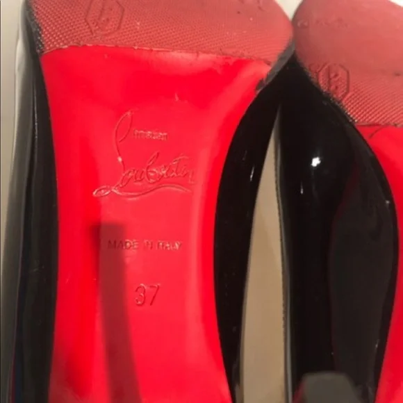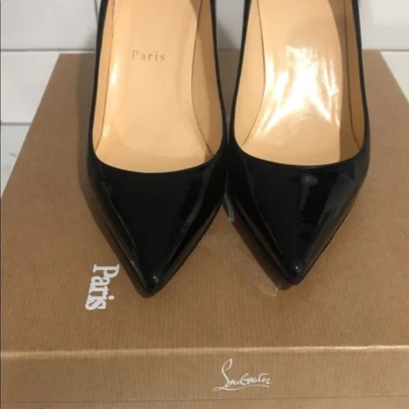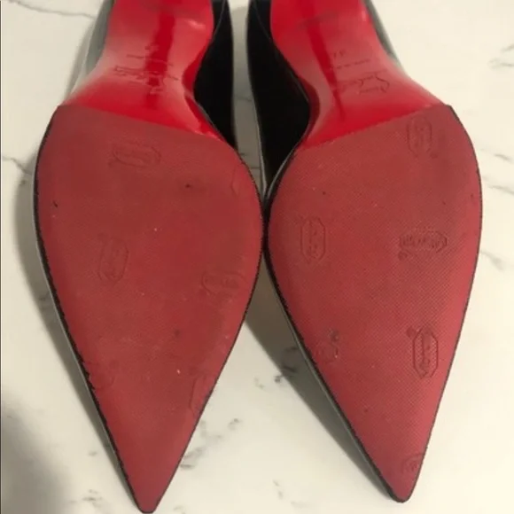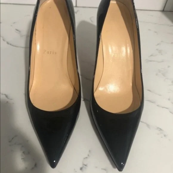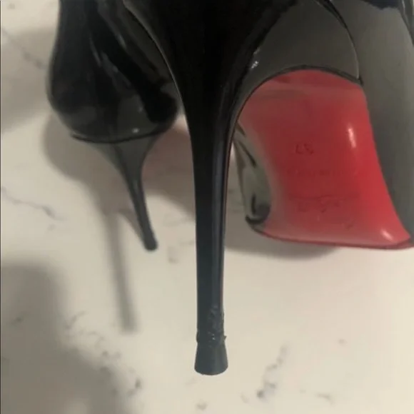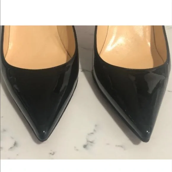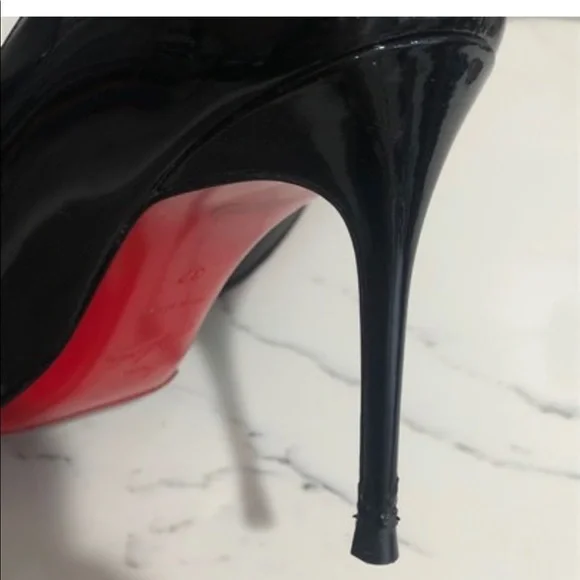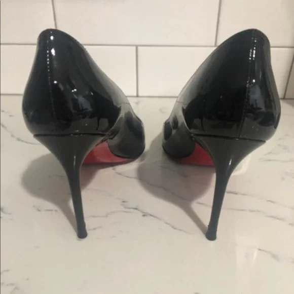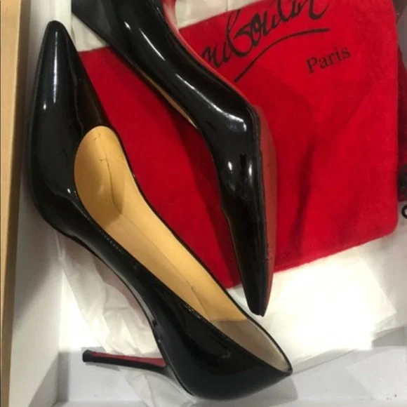 Christian Louboutin Décolleté 85mm black patent leather pumps. The patent on the shoe is in great condition with no scuffs. Light damage to the heels in the area by the heel tip. Visible wear on the insoles. Gold stamp on insole has faded. Please see all pictures. Box and dust bag included.
