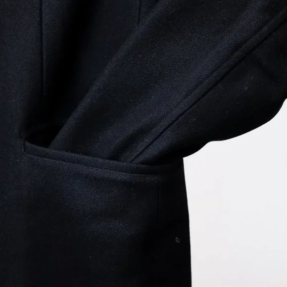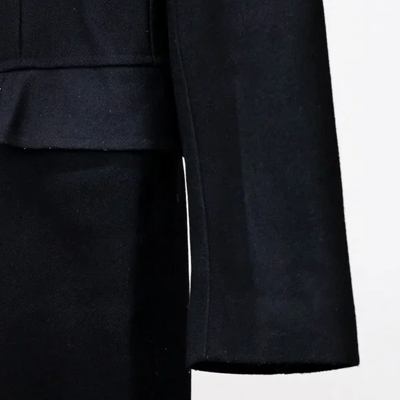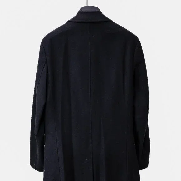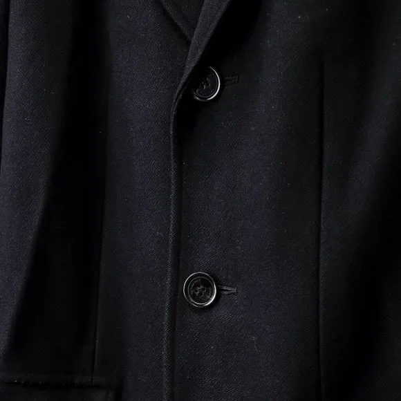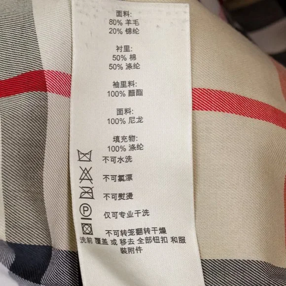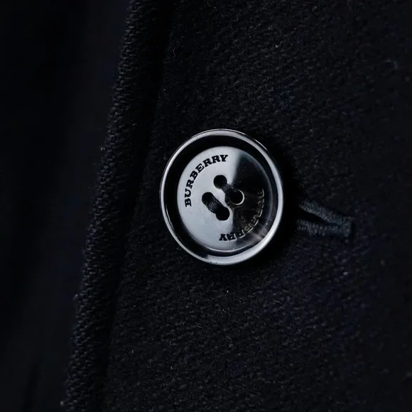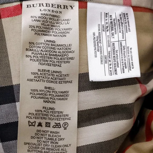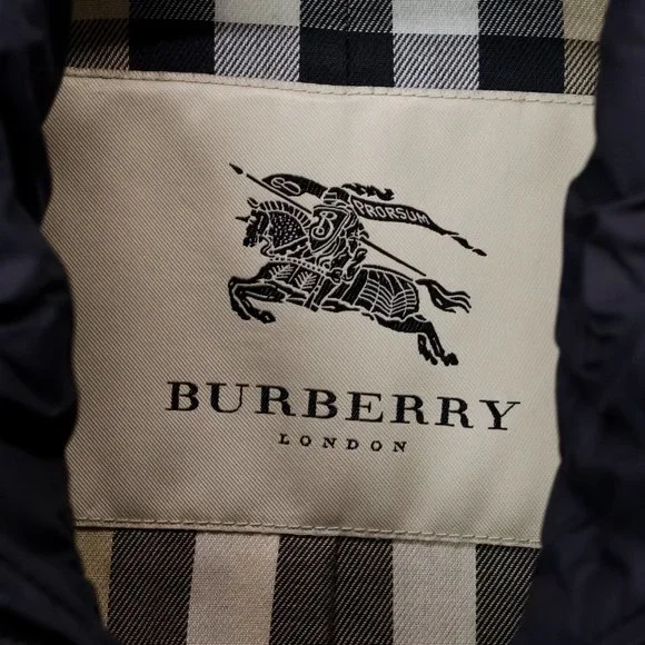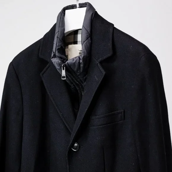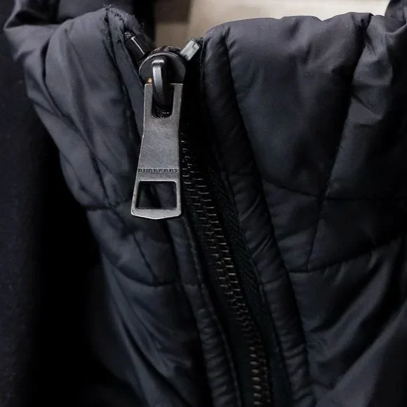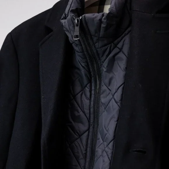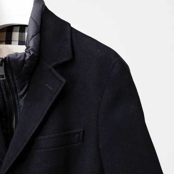A dual layered coat from Burberry with a removable puffer layer inside a black cotton overcoat. The puffer layer is built into removable with a pull-zipper at the seams, is quilted, and has front zip-closure. The exterior layer is a black coat with notched lapels, a 3-button up front, two side flap pockets, one slip pocket at the chest, and a single jacket vent. The interior of the jacket is lined with Burberry Check and an extra pocket. Size: See Measurements Condition: Excellent; some discolouration on zipperApproximate Measurements (Laid Flat):Shoulder:17.75” (45 cm)Chest: 15.25” (39 cm)Waist:18.5” (47 cm)Length down back: 39.25” (100 cm)Sleeve: 24.75” (63 cm)Composition: Main: 80% wool, 20% polyamide; Lining: 50% cotton, 50% polyester; Sleeve lining: 100% acetate; Shell: 100% nylon; Filling: 100% polyester