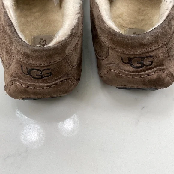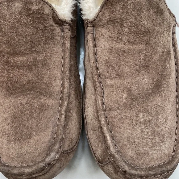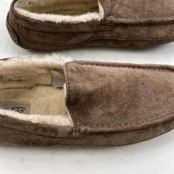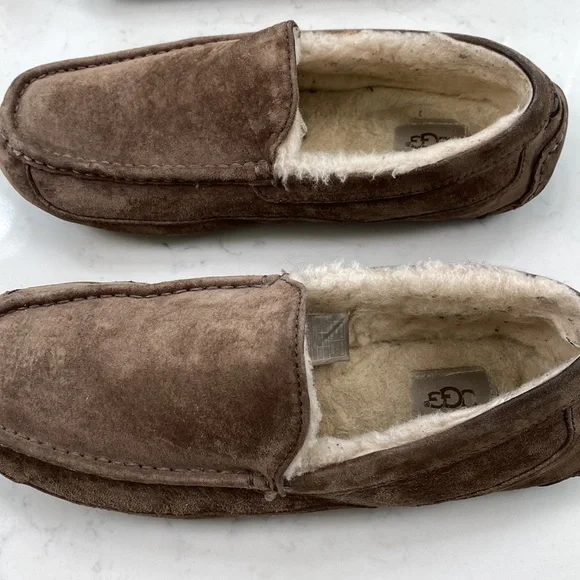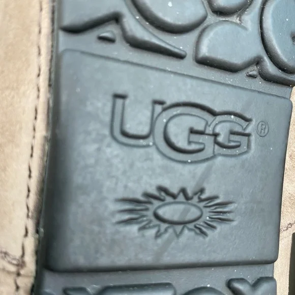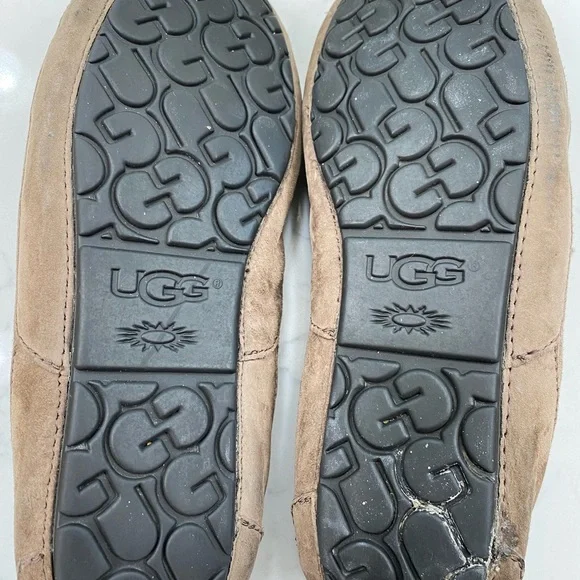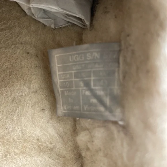 Ascot slipper with the UGGPLUSH, worn to school only.Wear on inside shows and there is no wear on tread as shown.Color is taupe.I don’t know exact name.