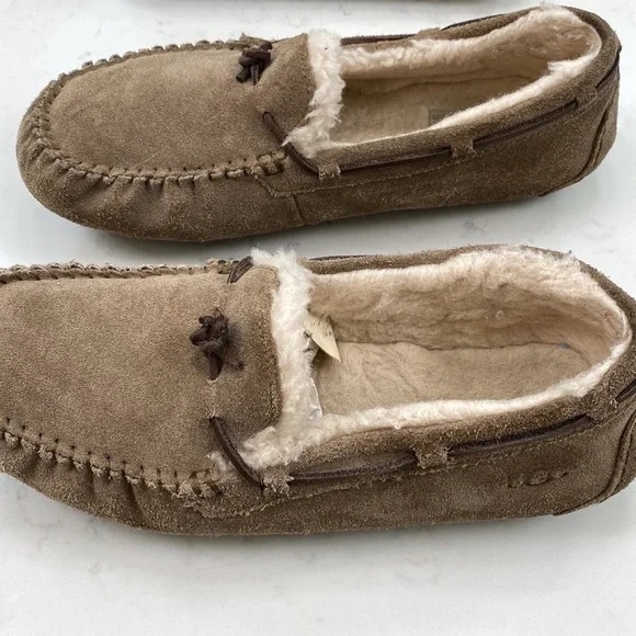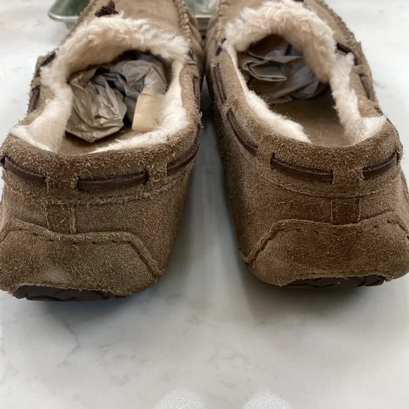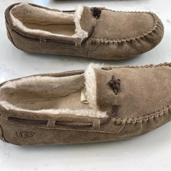 UGG Olsen slipper with UGGPLUSH worn to school onlyThe plush shows that wear.Soles look great.Tan in color