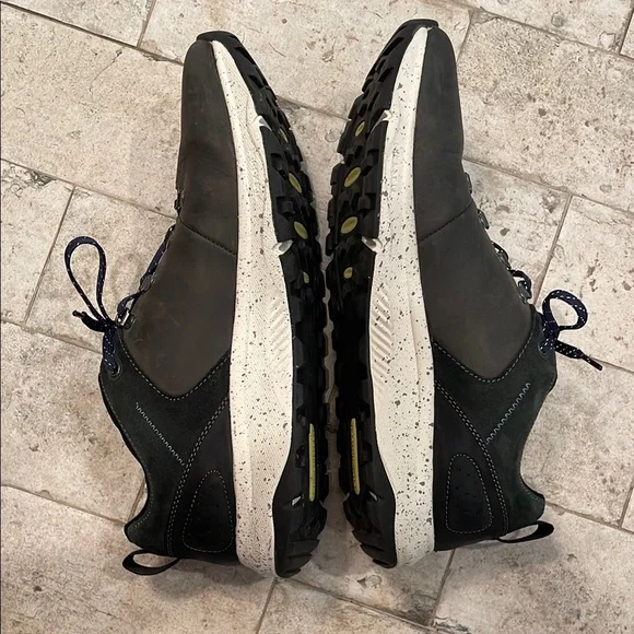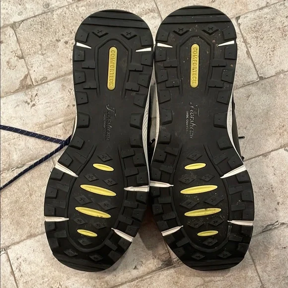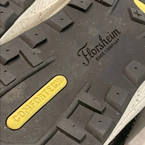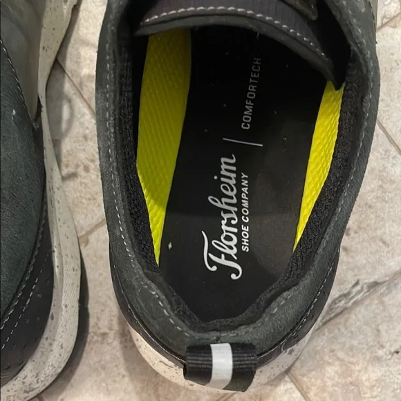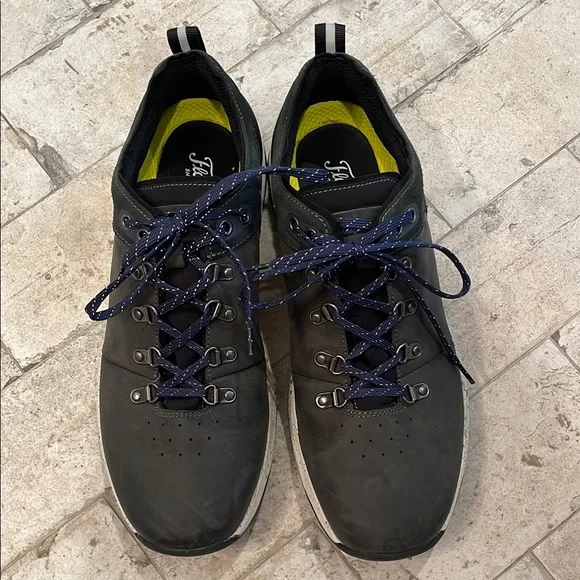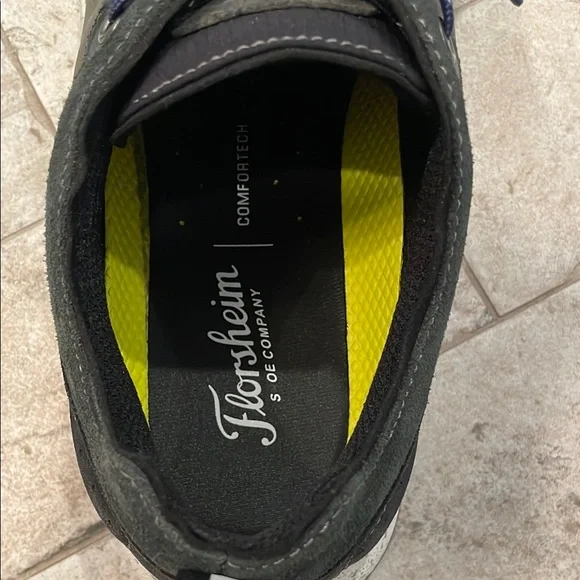 Florsheim athletic shoes feature a dark bluish gray body with navy blue accents and a neon yellow lining. The chunky white sole provides comfort and style for all casual athletic activities.Florsheim Treadlite Plain Toe Mens BlueLeather Lifestyle Sneakers Size 11 MPreviously owned; great condition.