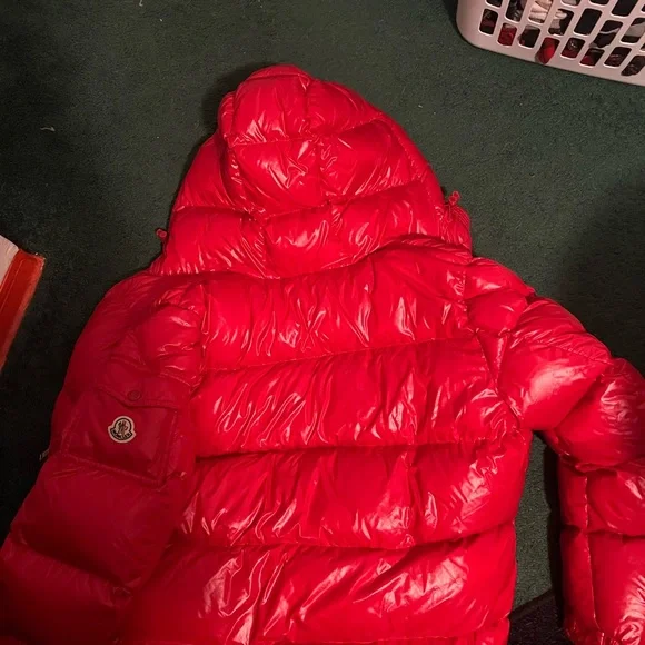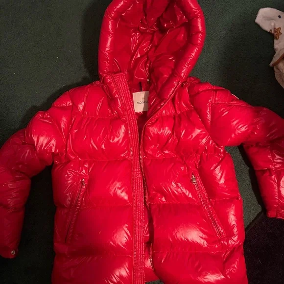 This Monclear puffer jacket is bright red, size 4. It has only been worn three times and has very minimal signs of wear on the cuffs. I have videos of my boyfriend opening it and...