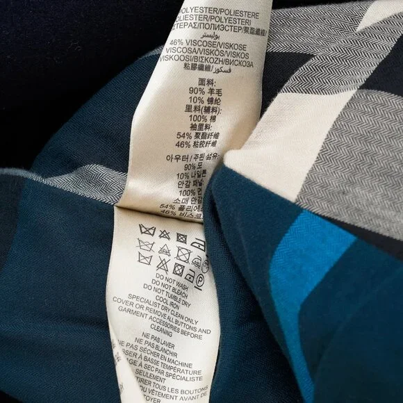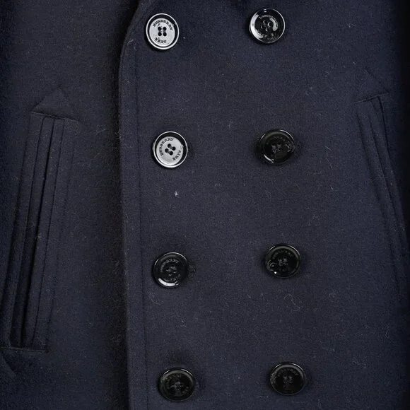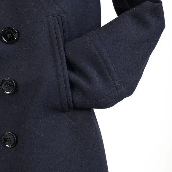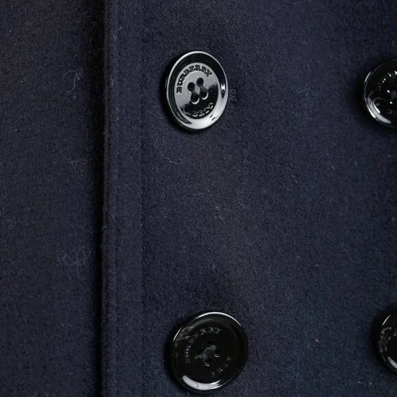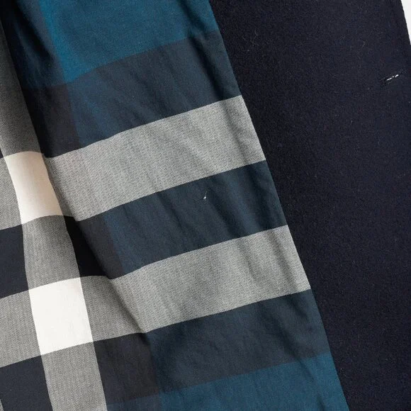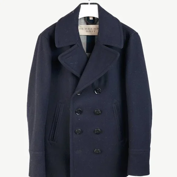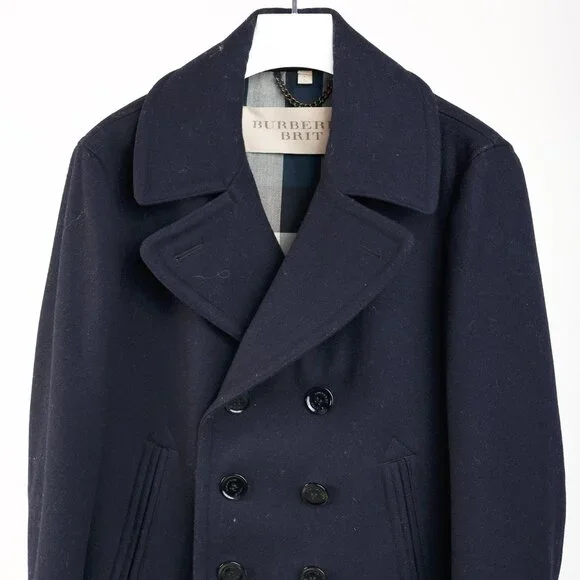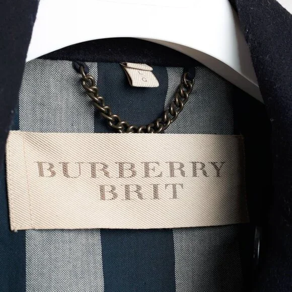 Circa 2012, this sartorial coat from Burberry Brit is crafted in a Navy wool blend, and features long sleeves, a lapel collar, a double-breasted button front, front oversized jet pockets, a back buttoned waist strap, a back vent, check lining on the bodice, and black satin lining on the sleeves.Size: LCondition: Excellent; light rubbing on collar, light pilling on cuffs. Comes with garment bag.Approximate Measurements (laid flat):Shoulder: 18.5" (47 cm)Chest: 20.75" (53 cm)Length from back: 30" (76 cm)Sleeve length: 26.75" (68 cm)Composition: Outer/main fabric: 90% wool, 10% polyamide (nylon). Lining panels: 100% cotton. Sleeve lining: 54% polyester, 46% viscose.