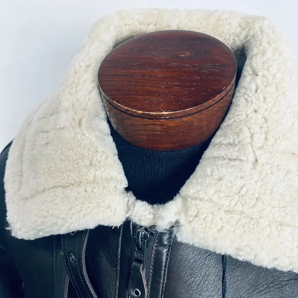 Avirex Civilian & Military Tailor Brown Leather Bomber Jacket with Sherpa Lining. New, with tags! Experience the timeless appeal of the Avirex Bomber Jacket, crafted in a rich brown hue with contrasting white accents. This jacket embodies the classic varsity style, featuring ribbed cuffs and waistband for a snug fit. The prominent Avirex branding across the back adds a bold statement to this iconic piece.