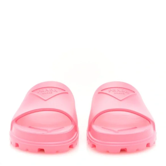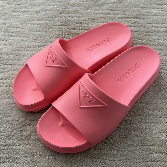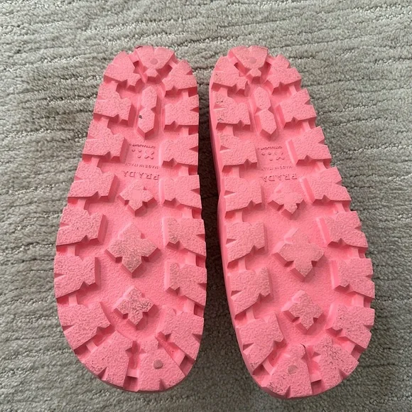 Great Condition Pink Rubber Prada Pool Slides size 38EVA Rubber Triangle Logo Embossed Womens Lug Sole 20mm SlideOnly worn indoors.They run true to size! Beautiful color pink and very comfortable!! They are just too big on me unfortunately