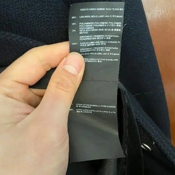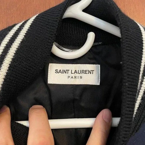 100% authenticPractically newSize 50Saint Laurent Teddy Varsity JacketFrom the 2015 Collection by Hedi SlimaneBlueStripedSatin LiningLeather Trim Embellishment & Mandarin CollarSlit Pockets & Snap ClosureDetailsSize GuideChest: 43.5"Shoulder: 18.5"Length: 25"Sleeve: 30.5"Fabric: 88% Wool, 10% Polyamide, 2% Silk; Trim 100% Lamb Leather; Lining 55% Cotton, 45% Cupro; Combo 100% Wool