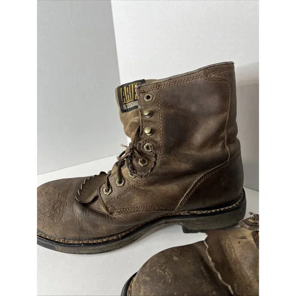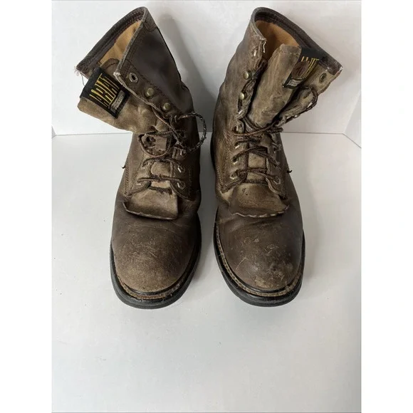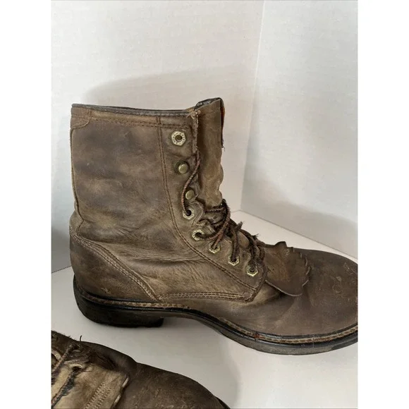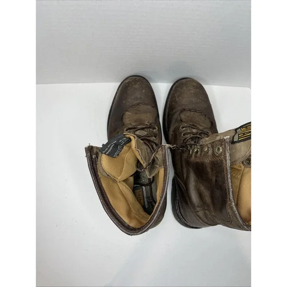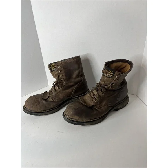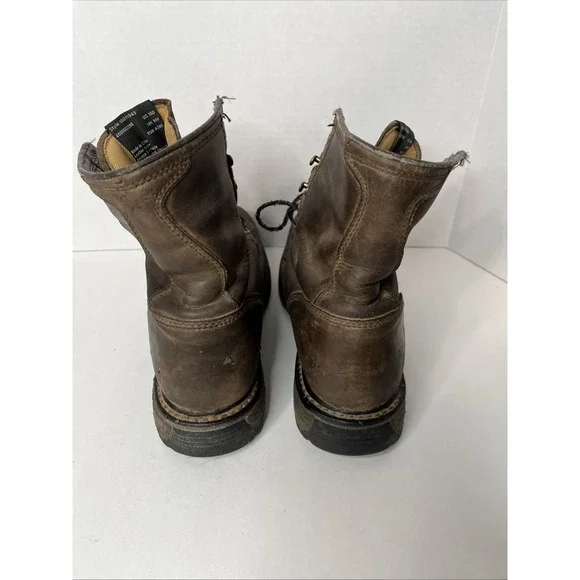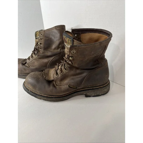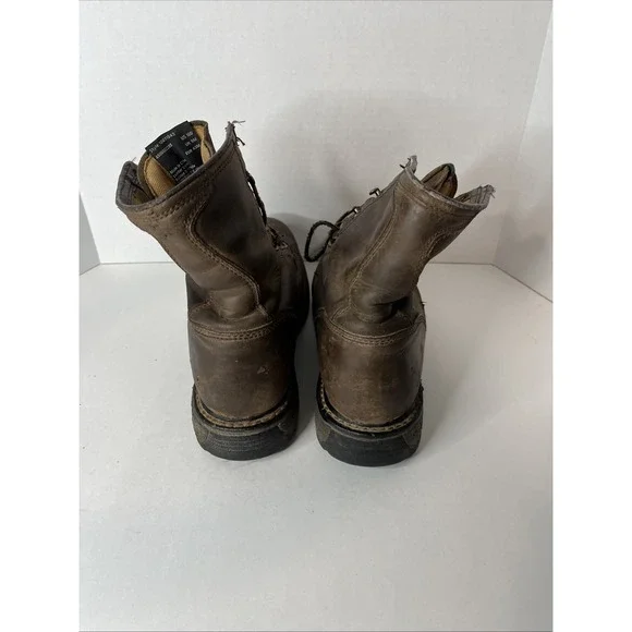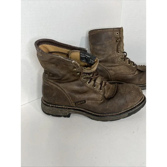 This is an Ariat Men Workhog 8" Waterproof COMP TOE Brown Leather Work Boot in size 10D. It features a round toe, lace-up closure, cushioned insole, slip-resistant outsole, and...